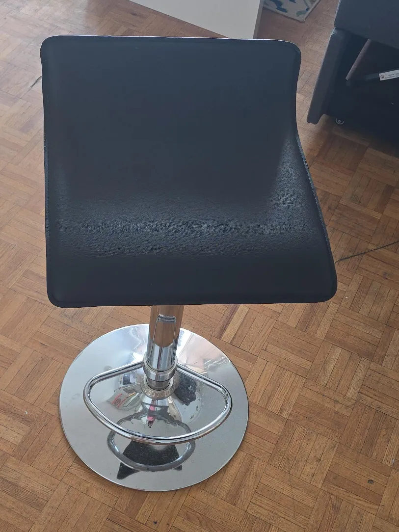 Selling a black adjustable bar stool. It's in good condition and would be a great addition to any kitchen or bar area. The seat is black and the base is chrome. It's easy to adjust the height to your liking!