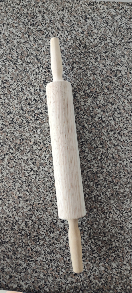 Here's a classic wooden rolling pin, perfect for all your baking needs! It's in great shape and ready to help you roll out dough for cookies, pies, and more. A simple and essential tool for any kitchen.