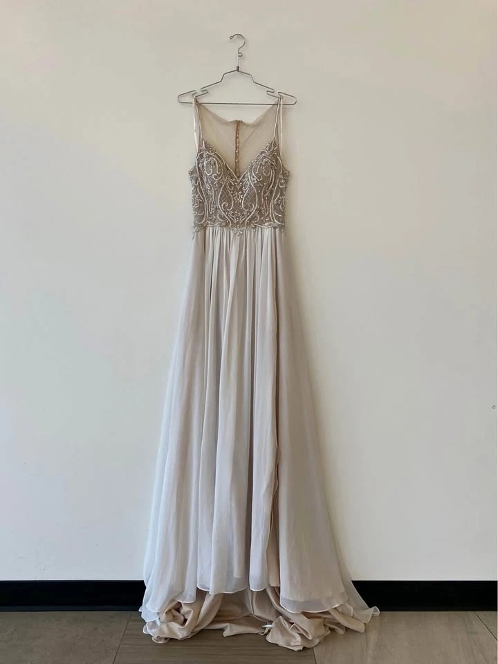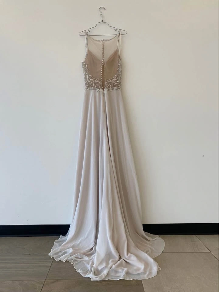 Floor-length a-line gown with a train. Beaded bodice. Sheer back. Button closure. Lightweight fabric. Perfect for a wedding or formal event.
