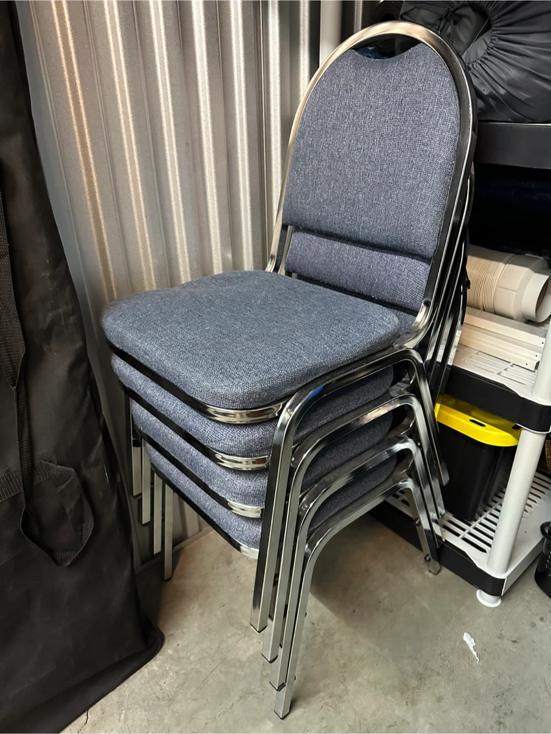 Selling a set of four stackable chairs, perfect for extra seating! They have a grey fabric padded seat and back, with a sturdy metal frame. Great for events or just having around the house