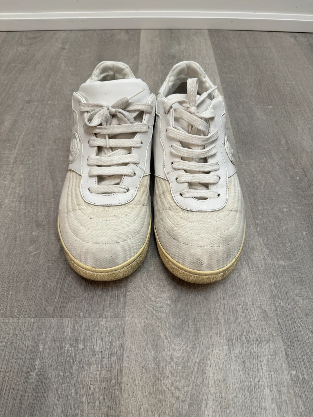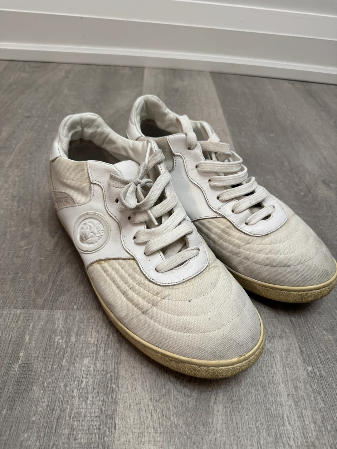 Selling a pair of Versace versus sneakers in white. They show some signs of wear, but still have lots of life left! They would be great for everyday wear.