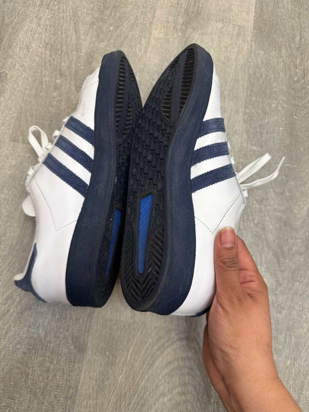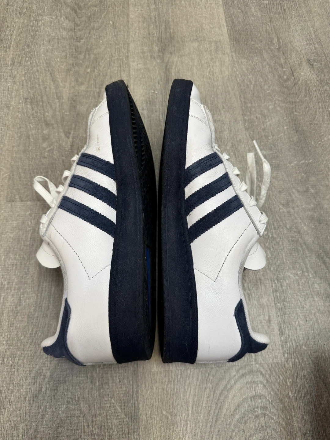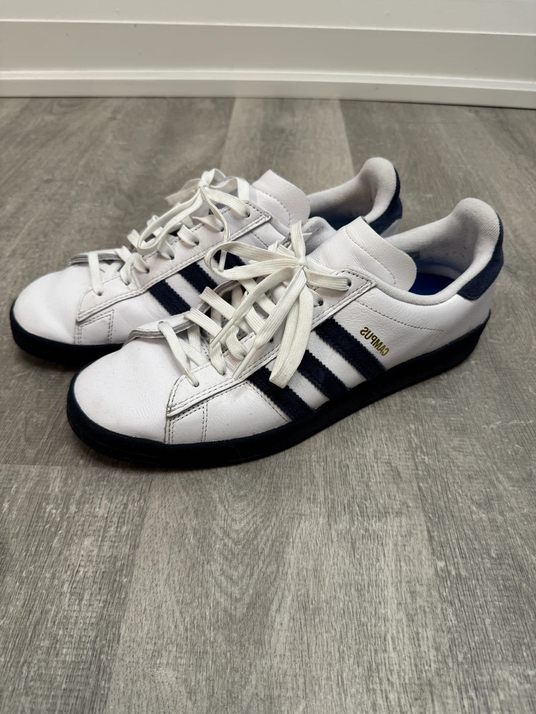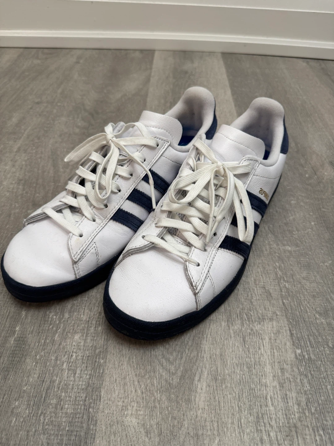 Selling a pair of Adidas Campus sneakers in white with navy blue stripes. They're in great shape and ready for a new home!