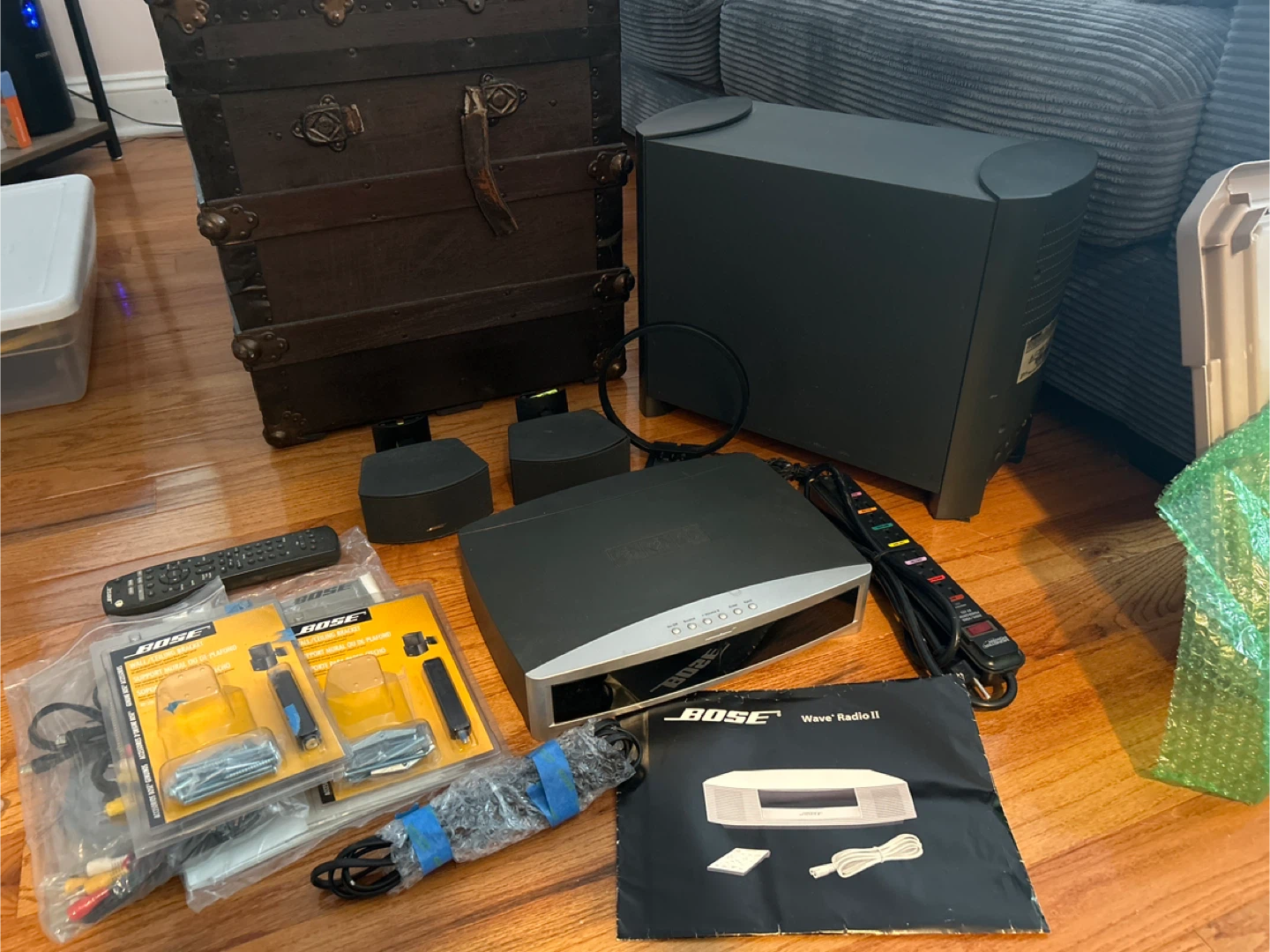 Selling a Bose Wave Radio II system. It includes the main unit, subwoofer, two satellite speakers, remote controls, and various cables and accessories. Perfect for enjoying high-quality sound in your home!