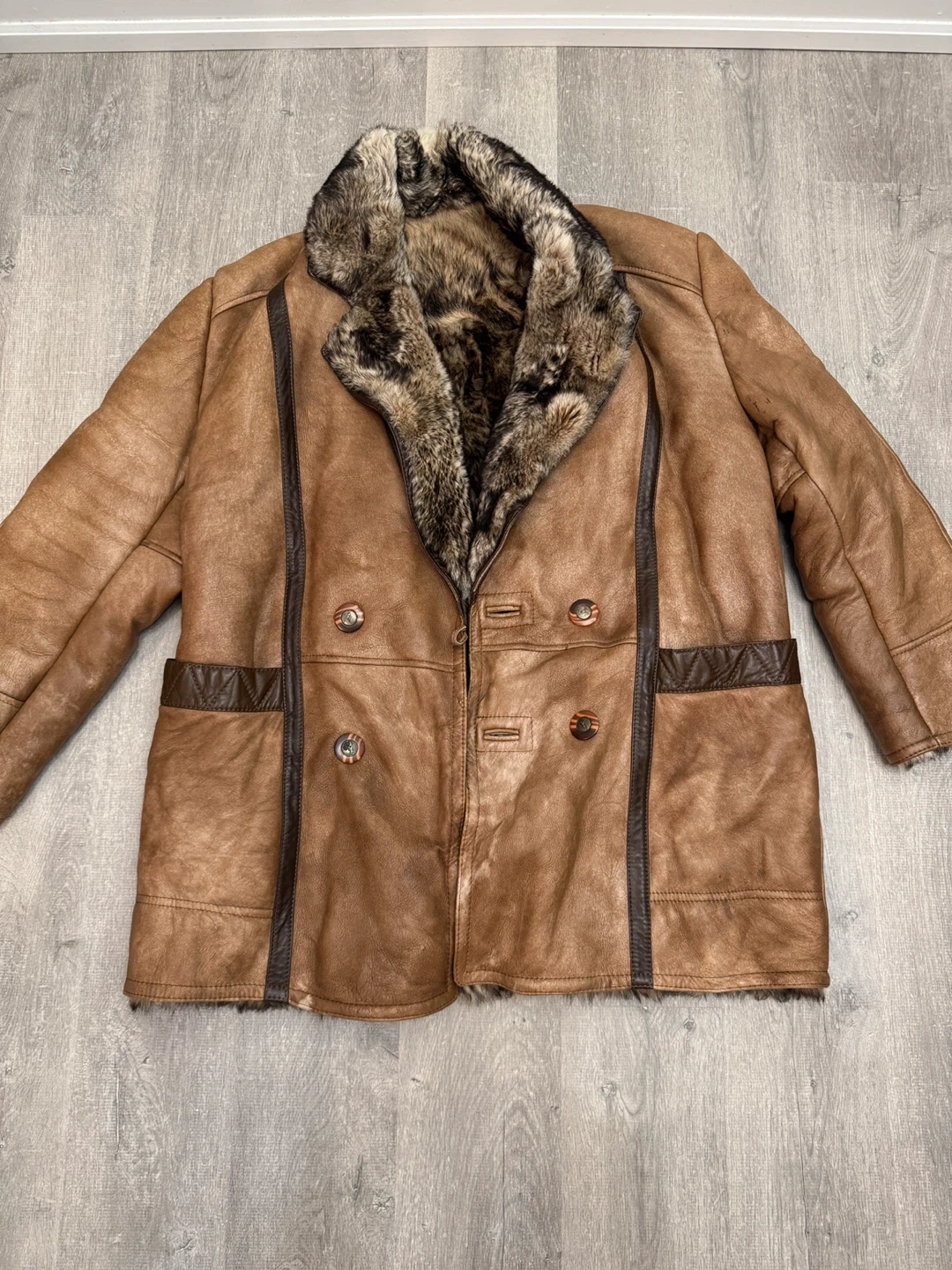Selling a vintage brown leather coat with a fur lining and collar. It's a unique piece with a classic look, perfect for staying warm and stylish during the colder months. The leather has a nice, worn-in feel, adding to its vintage charm