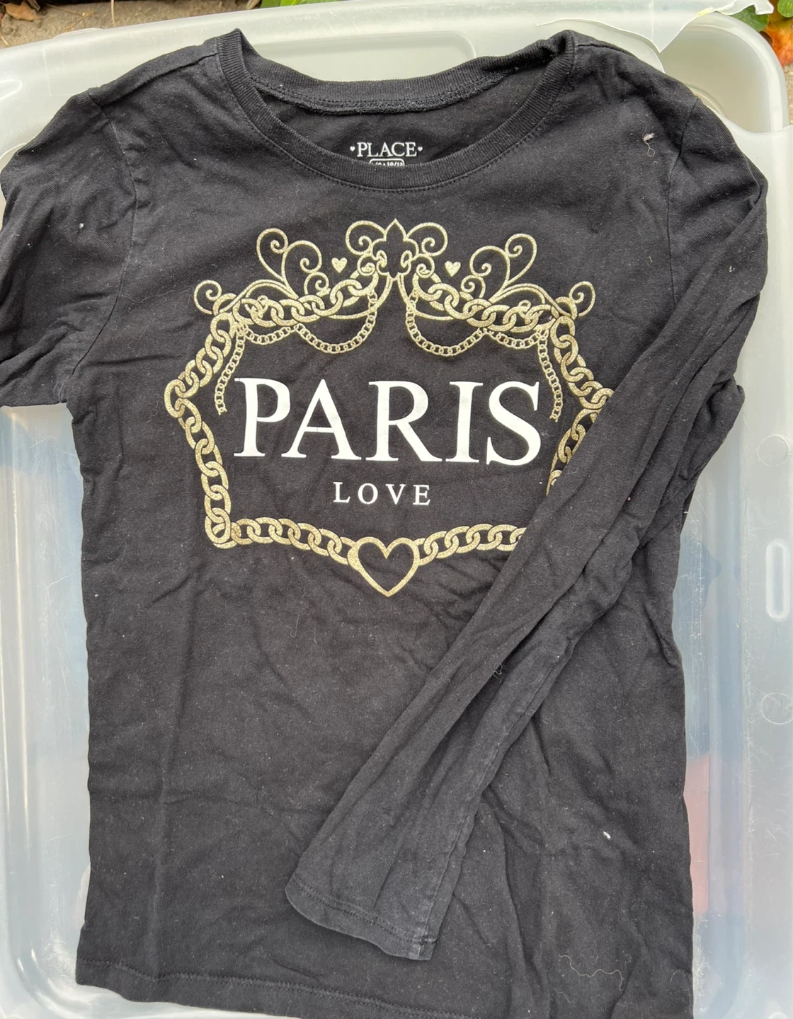 A cute black long-sleeve shirt from The Children's Place! It features a gold chain design with 'PARIS LOVE' printed on the front. Size is L (10/12)