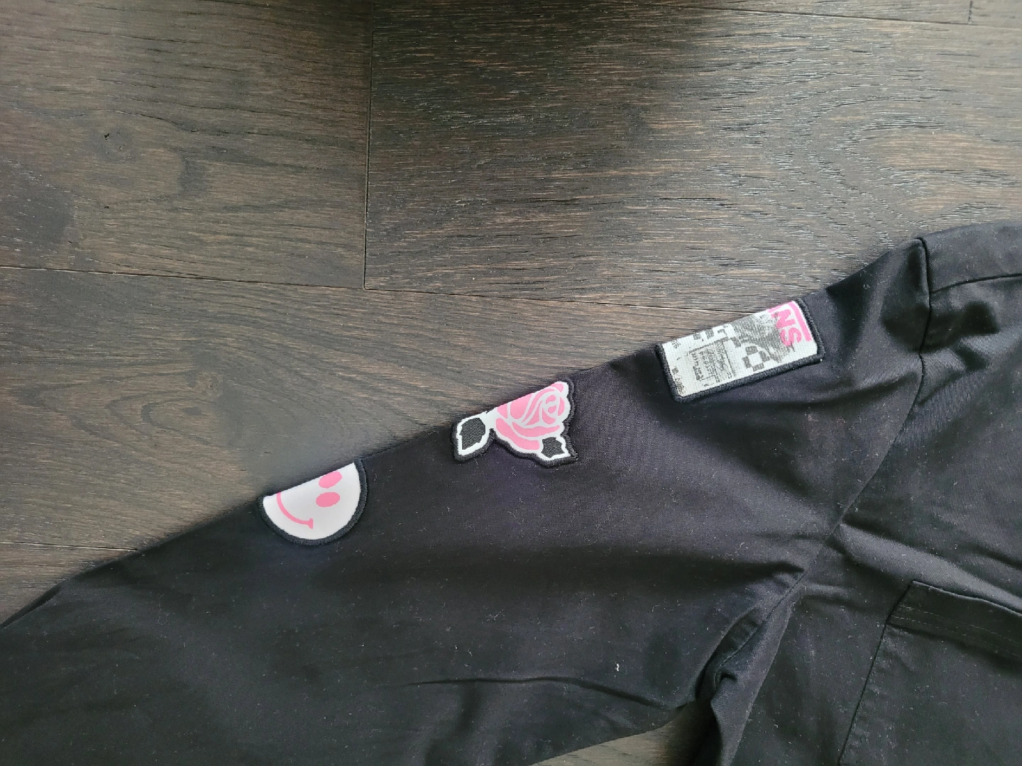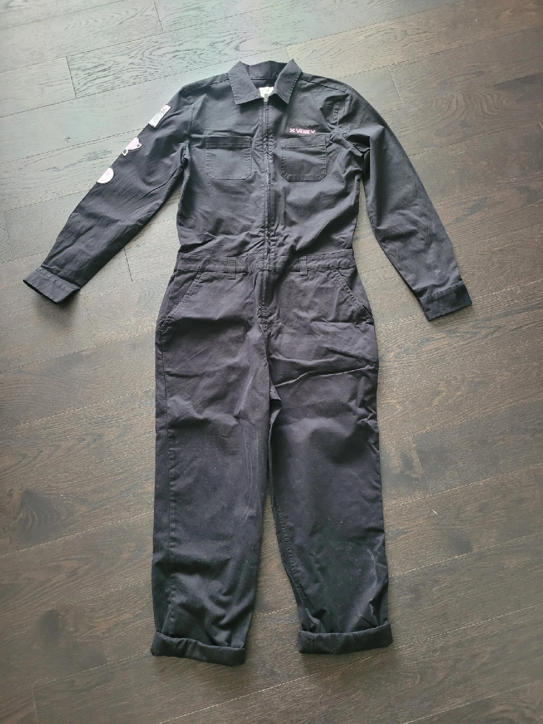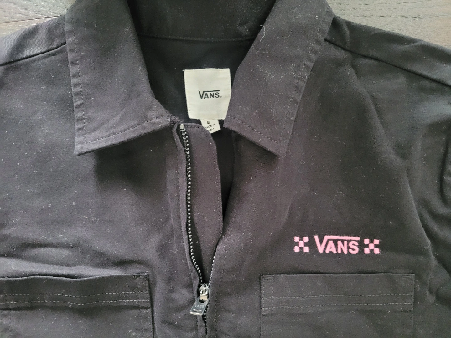Black Vans jumpsuit, size small. It has pink patches on the sleeve and the Vans logo embroidered on the chest. Completely brand new.