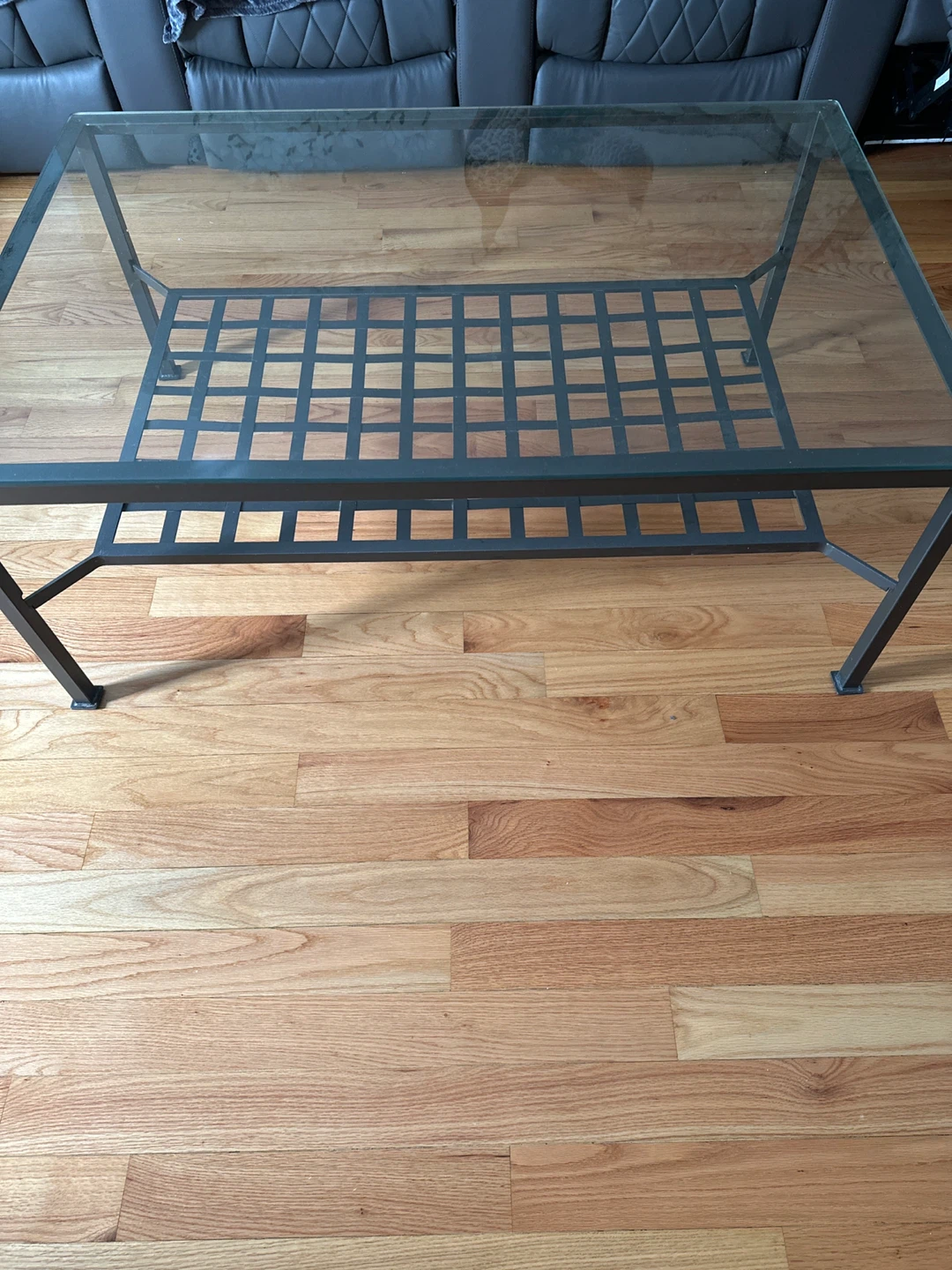 coffee table with a glass top and a metal frame. It's in okay condition NOT GREAT