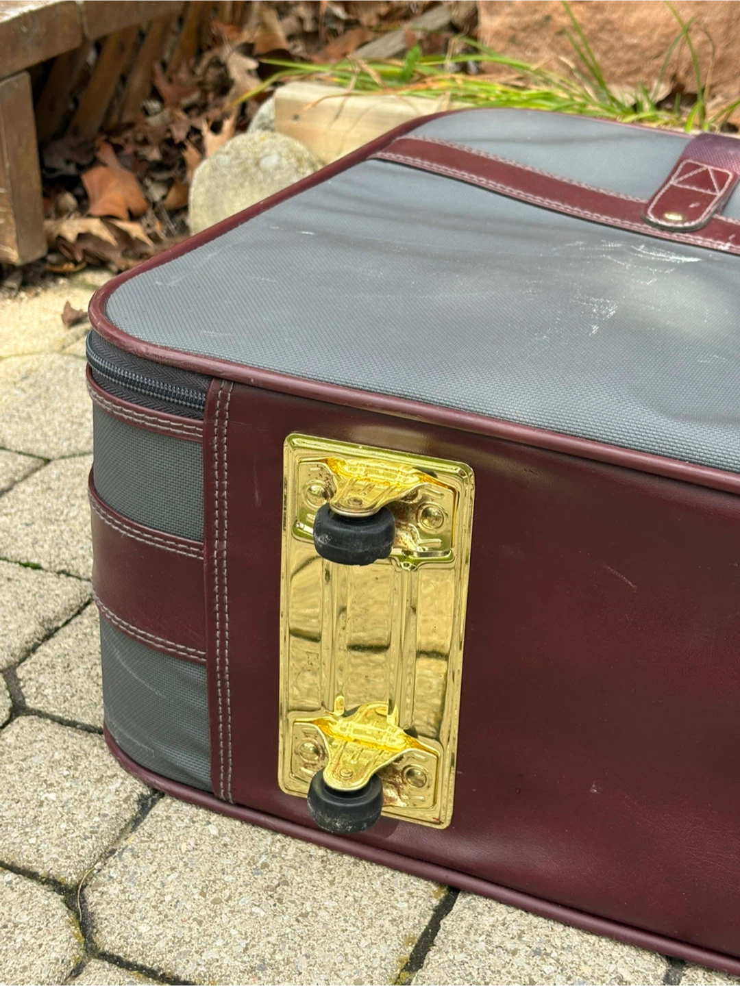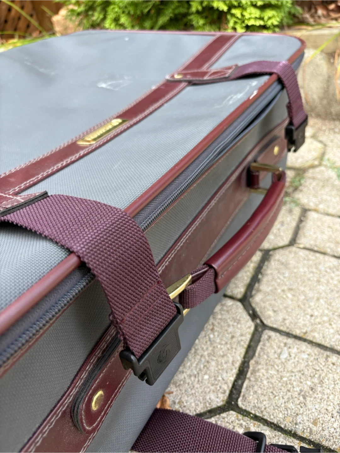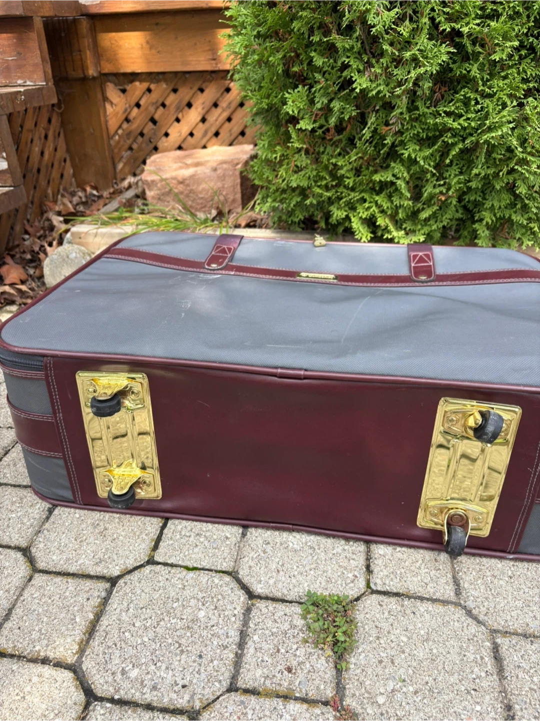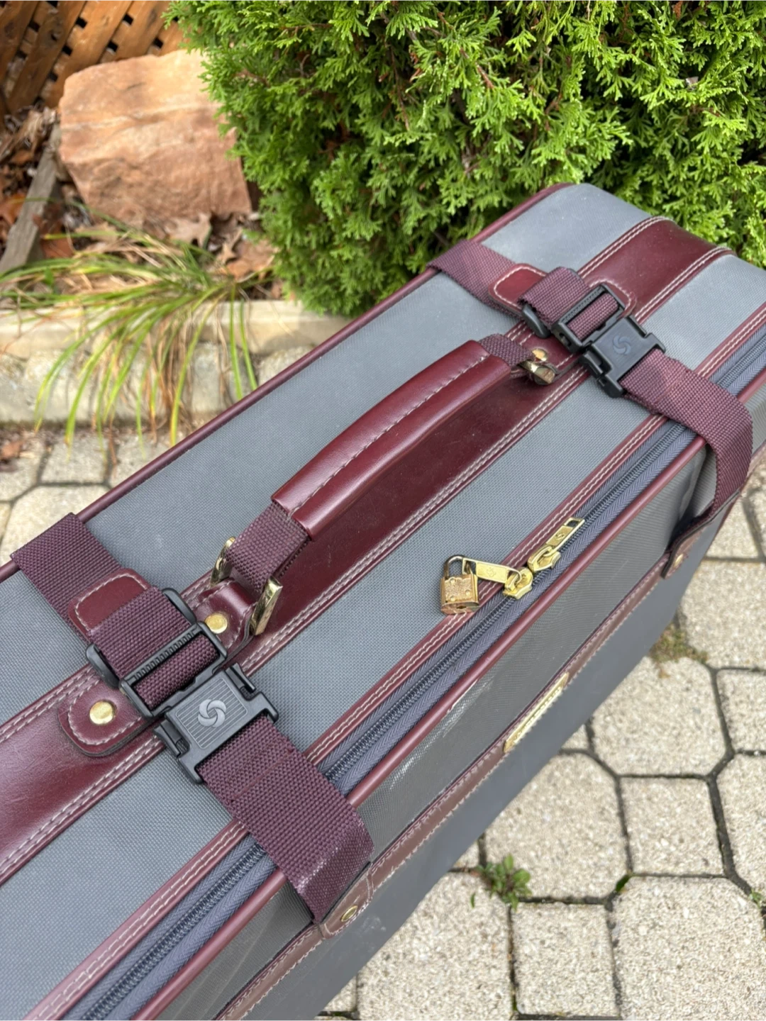 Selling a vintage Samsonite suitcase in grey and burgundy. It could use a little dusting, but otherwise it’s in great condition, all parts are working. Dimensions are 19”H x 24”W x 9”D.