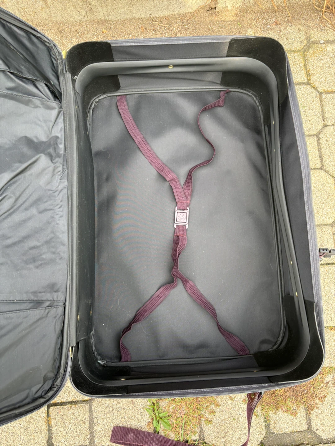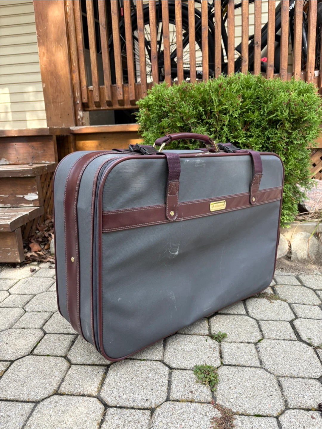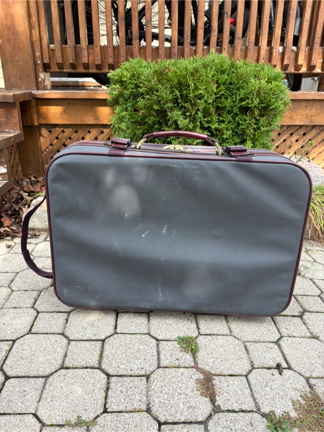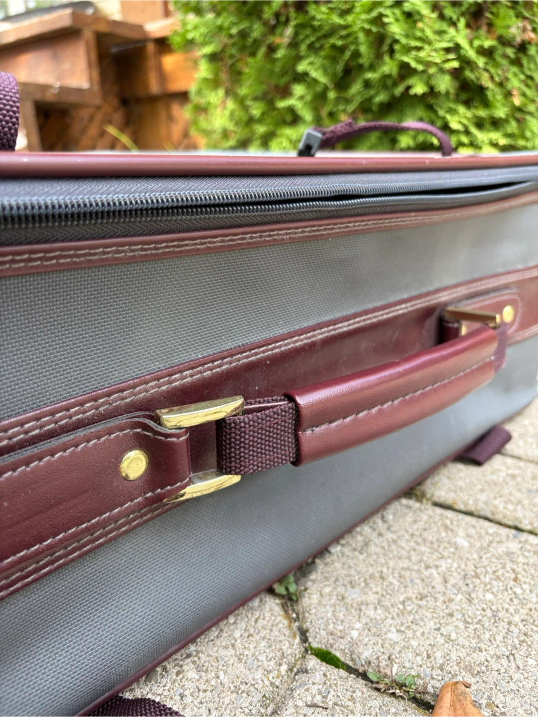 Selling a vintage Samsonite suitcase in grey and burgundy. It could use a little dusting, but otherwise it’s in great condition, all parts are working. Dimensions are 19”H x 24”W x 9”D.