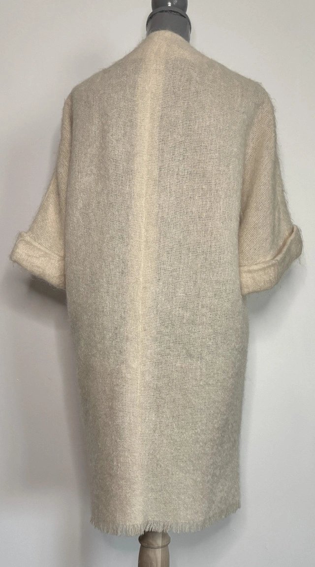 Wrap yourself up in cozy elegance with the Andrew Stewart Mohair Blend Women’s Open Cardigan Sweater. A luxurious feel for those crisp fall days, a chilly winter evening or lounging around on your comfortable sofa. Made from a luxurious 60/40 wool/mohair blend, this soft and lightweight cardigan offers lightweight comfort in a classic look with shorter sleeves. The open design adds effortless style to your wardrobe, making it perfect for layering over any outfit from casual daytime apparel to nighttime clothing. Whether you are dressing up or keeping it casual, this timeless mohair blend sweater is a must-have for cozy, sophisticated fashion. This is a one size cardigan. For measurements, please see the attached picture included with this listing. Local pickup is in Etobicoke near Islington and The Westway.