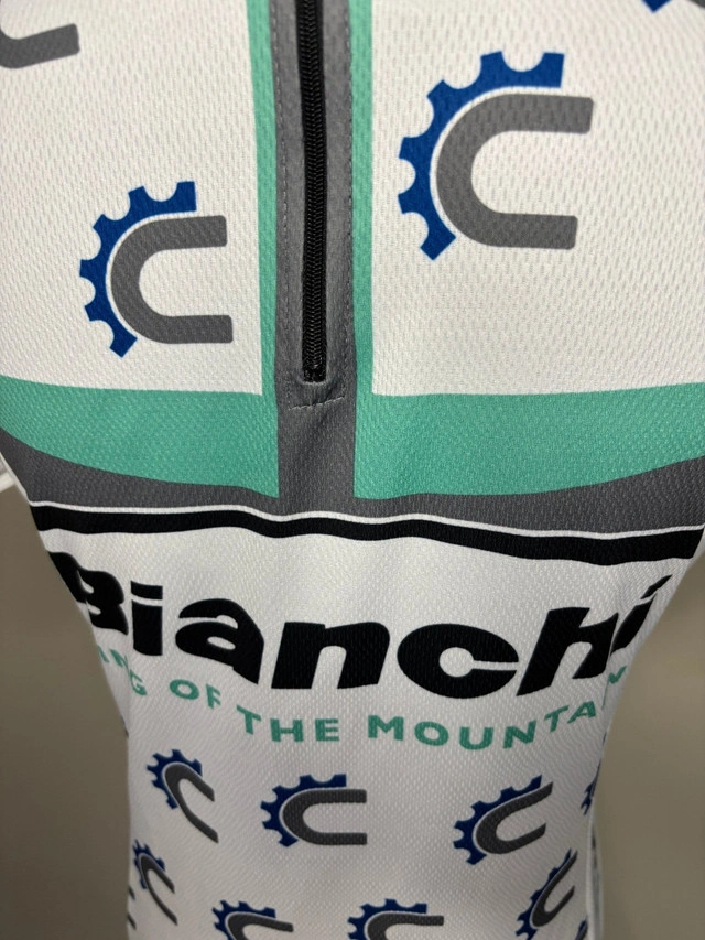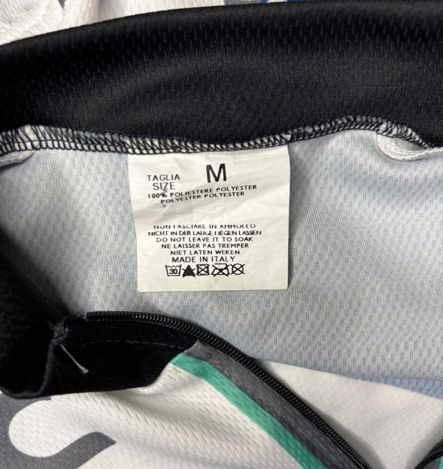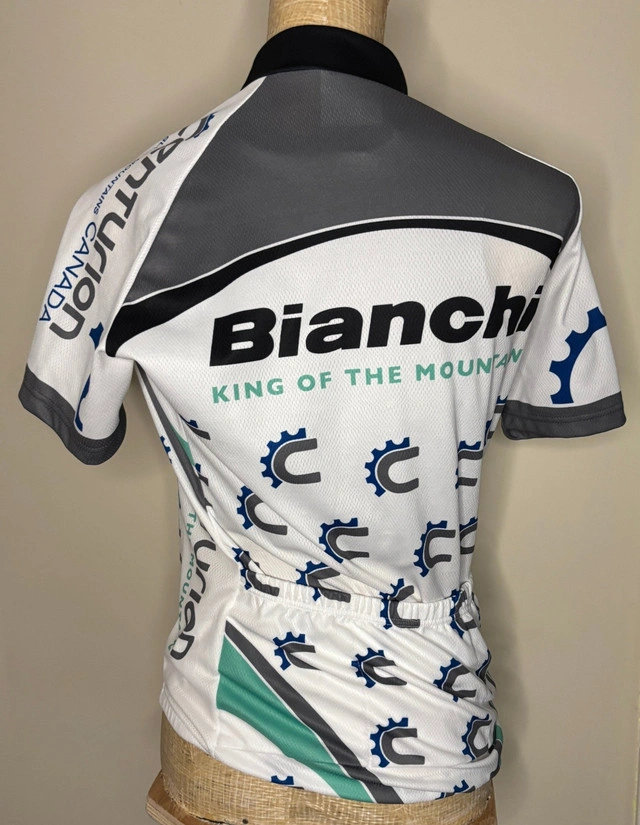Gear up for your next ride with the Bianchi King of the Mountain Cycling Race Jersey. Designed for performance and comfort, this jersey features a sleek, aerodynamic fit, 100% polyester breathable fabric, 1/4 zip front and moisture-wicking technology to keep you cool and dry during your intense rides. With the iconic Bianchi branding and King of the Mountain design and logo, this cycling jersey is perfect for both competitive cyclists and cycling enthusiasts. Whether you are racing or training or out for your normal ride, this jersey ensures you look and feel your best while conquering every climb. This is a size adult medium short sleeve Bianchi cycling jersey. For sizing specifics, please see the attached measurement guide included with the pictures in our listing. It is in excellent condition with no rips, stains or smell. Local pickup is in Etobicoke near Islington and The Westway.