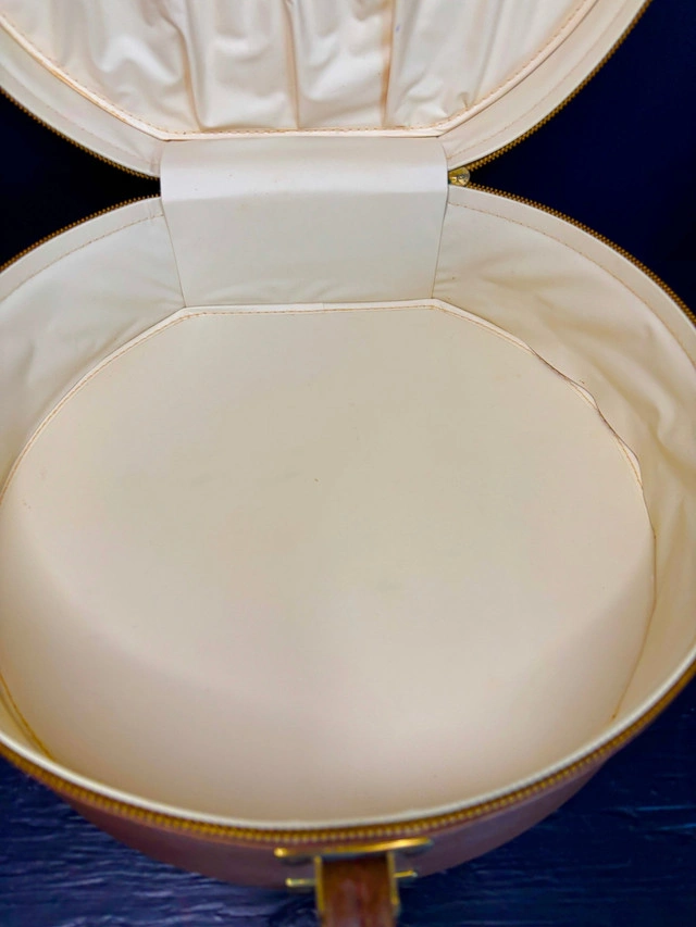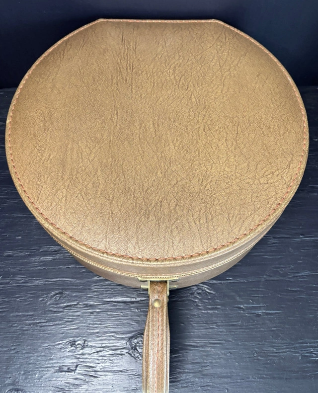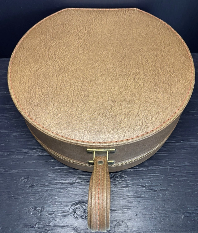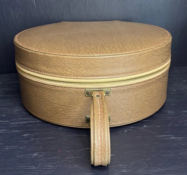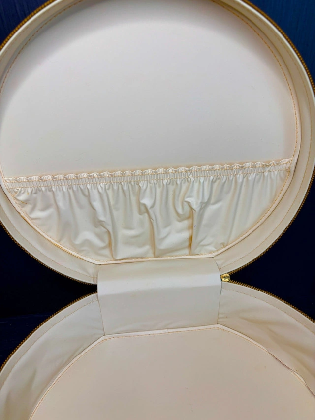 Picture yourself in the 1950's, travelling to your next destination adventure on a train that is resplendent with the sights and sounds of a simpler time. Light music coming from the entertainment car wafts through your cabin. Since the party is starting, it is time for you to get ready. You reach for your outfit for the night and this stunning Vintage Train Travel Makeup Wig Case and start to get ready for a memorable time. This charming retro travel bag is perfect for storing wigs, cosmetics, or travel essentials as you take your next journey. You can be on a day trip, a weekend away or a much needed vacation. this elegant case will be there with you every step of the way. This round travel case features a secure zipper closure and ample space to store clothing, makeup, wigs, or daily essentials, making it ideal for stylists and makeup artists that are on the go, collectors, or vintage enthusiasts. Add this to your travel luggage or wardrobe accessories and provide yourself with a stylish accessory to old-world glamour. This Vintage Train Travel Makeup Wig Case measures approximately 13 inches or 34cm in diameter and 3.5 inches or 9cm deep and is in excellent condition. Local pickup is in Etobicoke near Islington and The Westway.