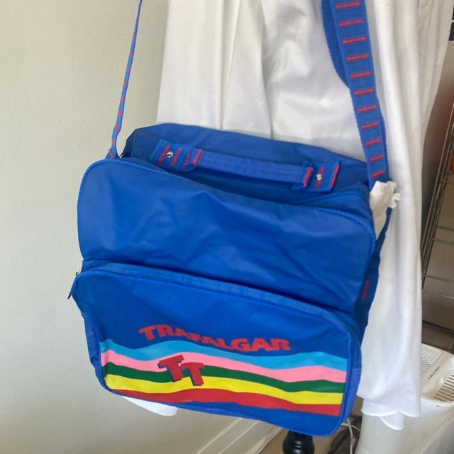 Brighten your everyday style with the Trafalgar Rainbow Carry On Crossbody Bag. Designed with both fashion and function in mind, this versatile nylon bag features a vibrant rainbow design on a blue background that adds a cheerful touch to any outfit. Measuring approximately 15 inches tall, 13 inches wide and 7 inches deep, it is compact yet spacious. The size, style and function is perfect for travel, commuting, shopping, or weekend adventures. Its adjustable strap ensures a perfect fit, while the lightweight design makes it easy to carry all day. Local pickup is in Etobicoke near Islington and The Westway.