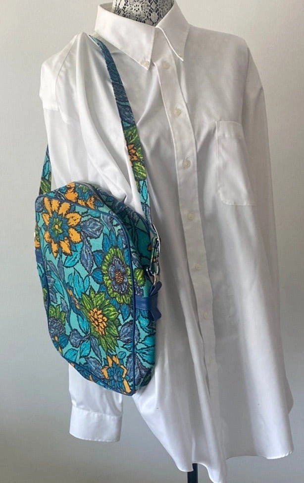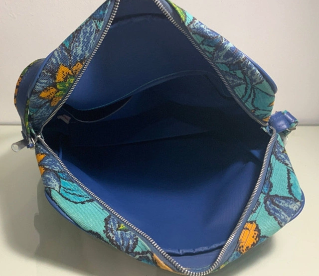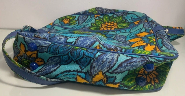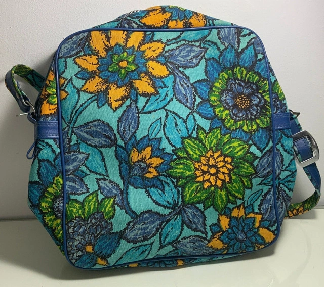 Just a fun and stylish way to board a plane or tour the town with this vintage made in Japan floral purse. The versatile purse can function as a carry on, a purse, tote, everyday bag or whatever your heart desires as this classic flowered graphics bag is stunningly attention grabbing and will be a focal point in your wardrobe accessory choices. The stunning blue background is accented with an array of flowers in wonderful mid century design aesthetics. It is eye catching and unique and will surely provide that necessary pop of color for your style choices. This Vintage Floral Handbag Carry On purse measures approximately 14” tall, 14” wide and 4” deep. The strap is approximately 34” at its longest adjustment. It is in excellent condition with no rips or stains with zippers and buckles functioning properly. Local pickup is in Etobicoke near Islington and The Westway.