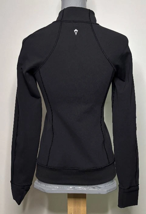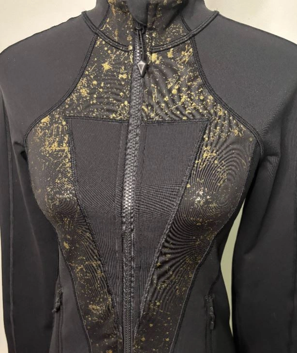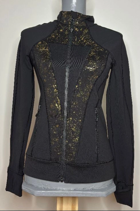 The Ivivva Athletic Fit Black and Gold Full Zip Jacket is designed for the dynamic individual who values both performance and elegance with a touch of flair. This Ivivva activewear jacket seamlessly transitions from an casual weekend to a business casual style with ease. The striking contrast of classic black and vibrant gold creates a look that is both powerful and sophisticated. Made with an 88/12 blend of polyester and lycra, it is lightweight yet durable, offering optimal comfort without sacrificing style. The slim, athletic fit allows this jacket to hug your body and enhance your silhouette. The wonderful V shaped gold geometric graphics on a black background allows for the right blend of color and neutral palette for you to wear it with a pair of jeans, shorts, slacks or skirt. The full zip front and zippered pocket lets it keep you and your essentials secure as you go about your day. This is a size women's 14 Ivivva jacket that is in excellent condition with no rips, stains or smell. For measurements, please see the attached photo included with this listing. Local pickup is in Etobicoke near Islington and The Westway.