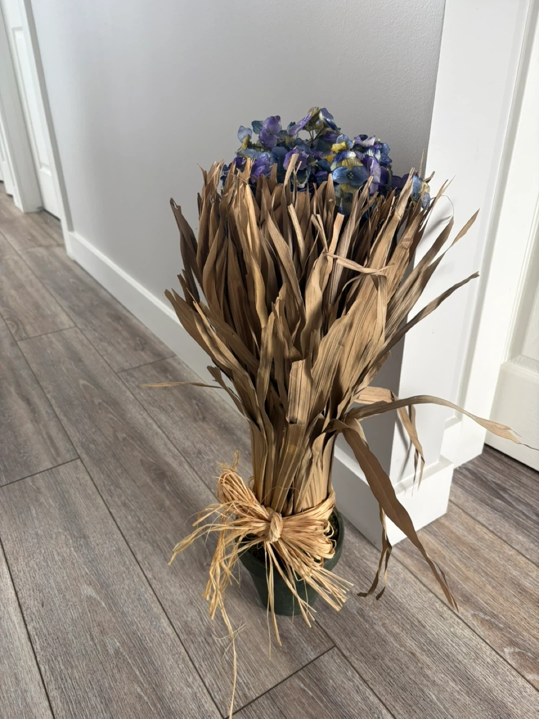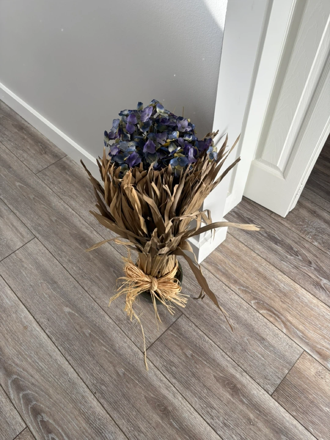 Selling an artificial hydrangea flower arrangement. It features blue and purple hydrangea blooms with dried leaves, tied with a raffia ribbon. Perfect for adding a touch of floral decor to your home without the upkeep of real flowers
