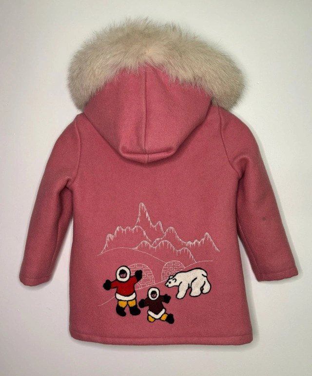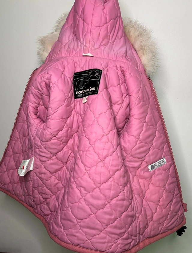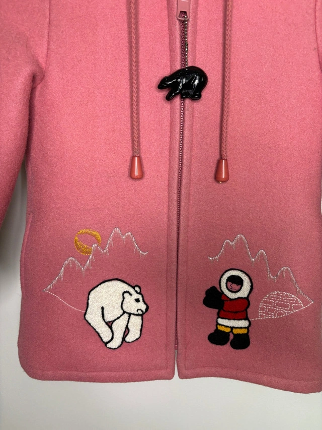 Wrap your little one in cozy comfort and style with the Northern Sun Indigenous Inspired Girls' Pink Wool Coat. This perfect blend of traditional craftsmanship and modern comfort features phenomenal Indigenous patterns on a pink background that reveals the stunning artwork of Native Canadian artists. Made with soft, warm wool, this coat is designed to keep girls snug during chilly seasons while celebrating rich Canadian cultural artistry. The authentic Indigenous designs offer unique, handcrafted patterns that honor Indigenous heritage and storytelling. The Northern Sun Indigenous-Inspired Girls' Pink Wool Coat is the essence of warmth and cultural beauty combined, and is perfect for school days, family outings, holiday gatherings, and Indigenous cultural events. This pink wool coat is a girls size 6. For measurements, please see the attached picture included with this listing. Local pickup is in Etobicoke near Islington and The Westway.