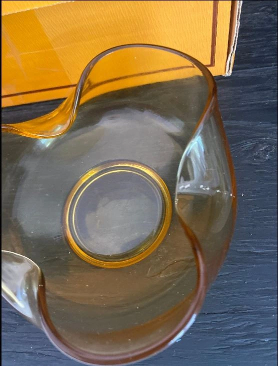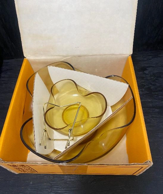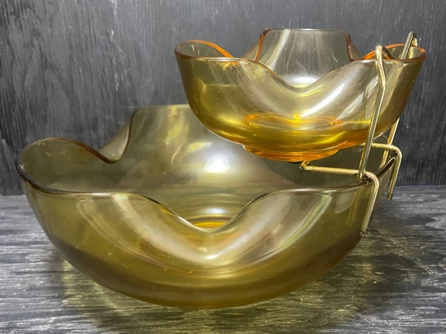 Step back in time to the glamorous era of Mid Century Modern entertaining with this stunning Anchor Hocking Chip and Dip Set. This is the complete, original three piece set in the highly desirable Honey Gold Amber glass color. Just imagine the warm glow this spectacular piece will bring to your next gathering, casting a beautiful, sunny color on your favorite snacks. This set is a piece of history that captures the sophisticated, casual style of the 1960s and 1970s. The Accent Modern pattern features a smooth, wave pattern glass bowl that is perfect for chips, nachos or any snack that you desire. It showcases a classic retro shape that will instantly elevate your home décor. The deep amber color is a collector favorite, perfect for adding an authentic retro style to your kitchen or living space. The set includes the large chip bowl, the matching smaller dip bowl, and the original brass tone metal bracket that securely attaches the dip bowl to the main serving bowl. This elevated design is what makes the set so famous and functional, keeping your dip perfectly positioned in a bowl, ready for your favorite dips. This vintage treasure is the perfect choice for the discerning host, the passionate Mid Century Modern collector, or anyone seeking a unique, conversation starting piece. Give your hosting a genuine vintage flair and make your party unforgettable. This Anchor Hocking Accent Modern Honey Gold Amber Glass Chip & Dip Bowl Set measures approximately 9.5 inches in diameter and is new old stock, never used. Local pickup is in Etobicoke near Islington and The Westway.