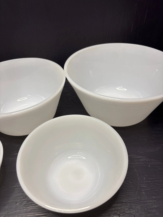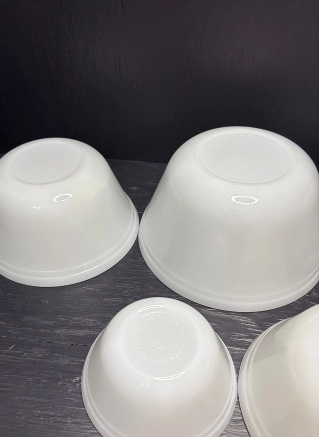 Add a versatile and affordable white mixing bowl set to your kitchen and go back in time with this Federal Glass Milk Glass White Mixing Bowl Set. This mid century modern collection combines function with timeless elegance and style and will look great in any kitchen setting. Made from durable milk glass, these Federal Glass bowls feature a classic white finish and a smooth, sturdy design that is perfect for mixing, serving, or displaying. Each bowl is stackable for easy and compact storage, making them ideal for modern or rustic kitchens with a retro touch. For use for a professional baker or home cook, these Federal Glass nesting bowls are perfect for prepping, mixing, blending your favorite recipes with a dab of nostalgic charm to your kitchen. This set contains 5 mixing bowls that measure 9, 8, 7, 6, and 5 inches in diameter and are in excellent condition. Grab this Federal Glass Milk Glass White Mixing Bowl Set for a complete set of mixing bowls that will suit all of your cooking needs. Local pickup is in Etobicoke near Islington and The Westway.