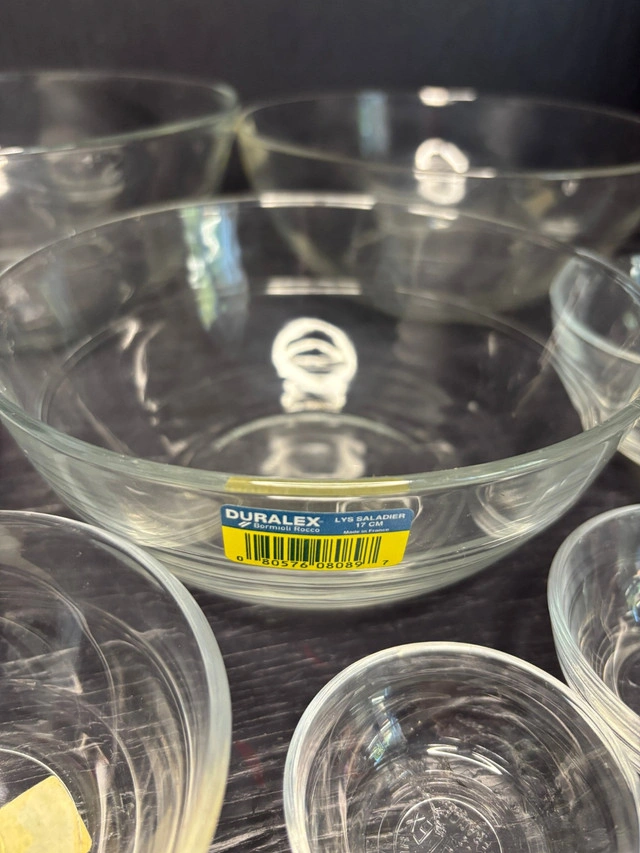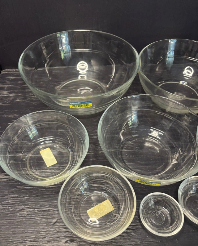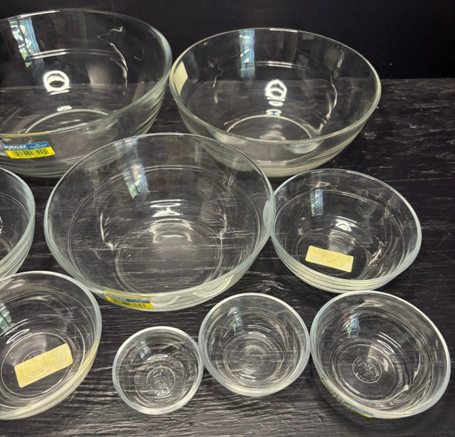 Get a great kitchen workhorse made for your everyday cooking needs with this wonderful Duralex Bormioli Rocco Lys 9 Piece Glass Mixing Bowl Set. Not only to upgrade your kitchen, but to use and enjoy as you create your favorite recipes, this Duralex Bormioli Rocco Glass Mixing Bowl Set is the perfect blend of durability, functionality, and timeless French design. Made from tempered glass, these bowls are durable and aesthetically pleasing, making them ideal for any kitchen color scheme and décor options. The stackable design fits neatly into any cabinet and will save space in your kitchen. Use them for mixing, marinating, serving salads, or as stylish bowls to prepare your meals. These are microwave and dishwasher safe for effortless cleanup and reheating. This set has the smallest bowl measuring approximately 2.25 inches in diameter while the largest bowl measures approximately 9 inches in diameter...and you get all sizes in between! Add this great mixing bowl set to your kitchen today and never again need another mixing bowl. Local pickup is in Etobicoke near Islington and The Westway.