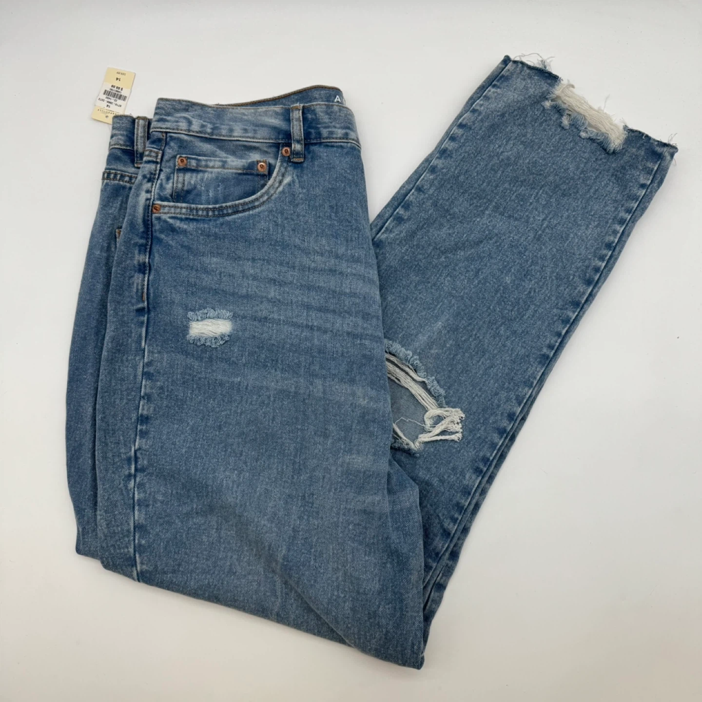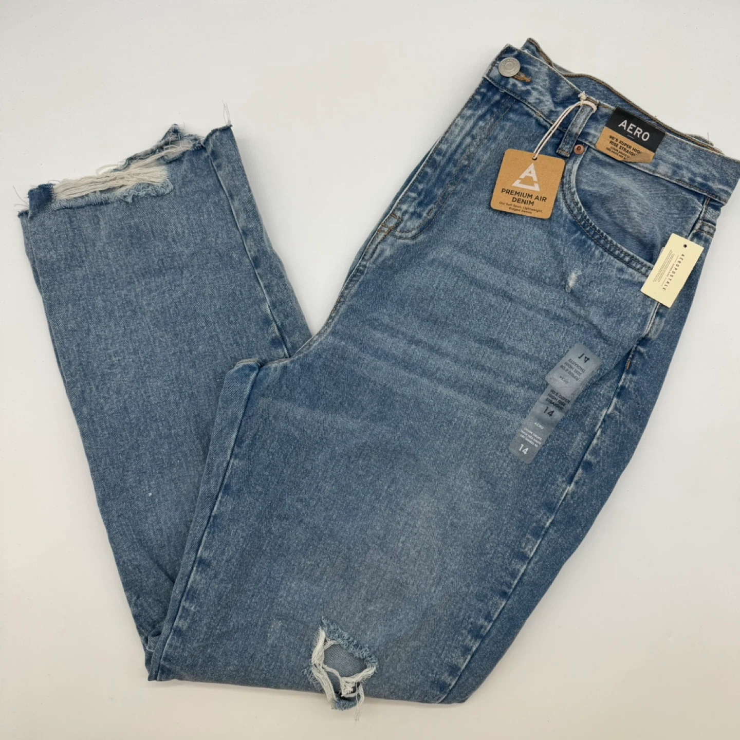 93This stylish pair of Aéropostale 90's Super High Rise Straight Jeans is brand new with tags. Made from 100% premium cotton denim, they feature a medium blue wash with distressed details and a frayed hem for a trendy, vintage-inspired look. These jeans offer a high-rise waist and straight-leg fit, combining comfort with a classic 90's style. The zip fly with button closure adds durability, while the soft, lightweight Premium Air Denim fabric ensures a comfortable wear all day. Size US 14 (approx. UK 18 / EU 46) - fits a waist around 33-34 inches. Originally priced at $59.99, this pair is perfect for casual everyday outfits. ° Pickup in North York Delivery available for extra CLJ32
