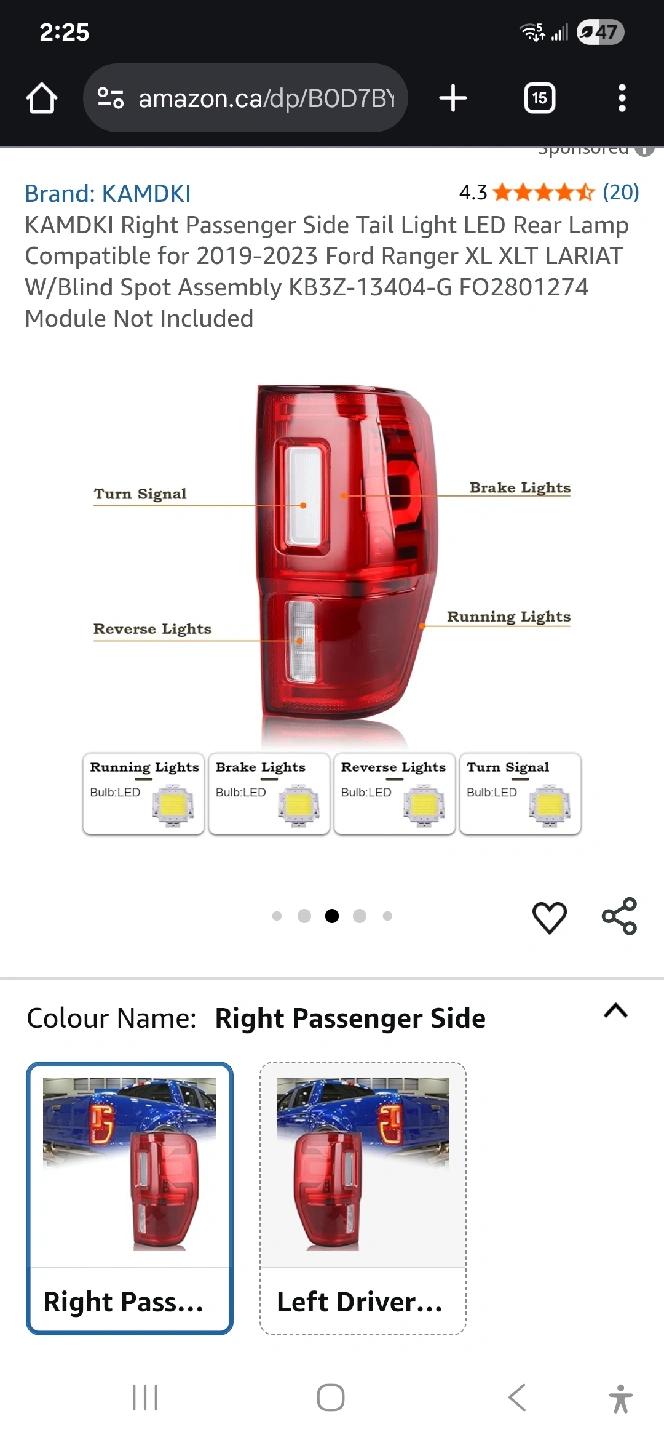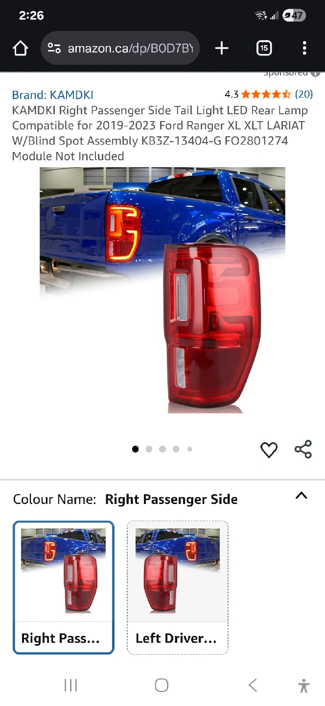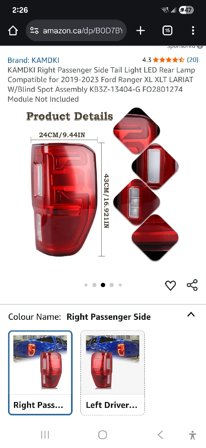 197Selling a KAMDKI right passenger side tail light. It's an LED rear lamp compatible with 2019-2023 Ford Ranger XL XLT LARIAT models. Dimensions are 24cm x 43cm.