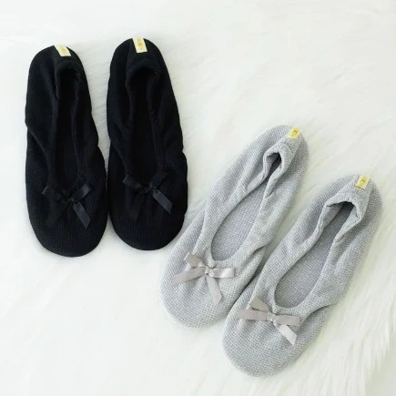 Cute and comfy slipper in black and gray! Perfect for lounging around the house. They have a soft, flexible fit and a sweet little bow detail