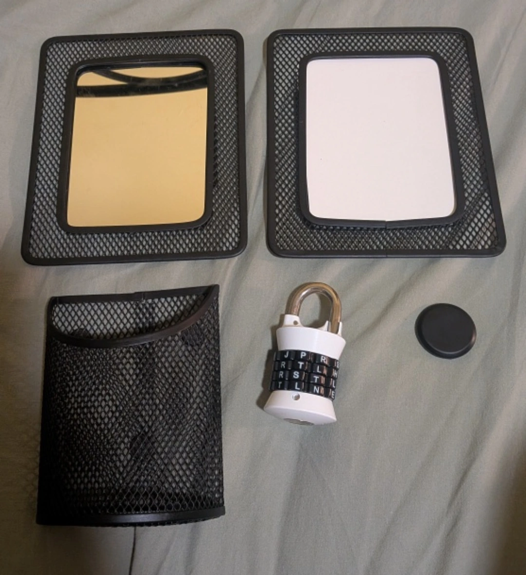 118Selling a black locker organizer and lock set - 5 piece. Includes a mesh pen holder, a mesh whiteboard, a mirror, a word combination padlock and a small black magnet. Brand new never used.