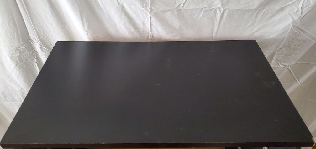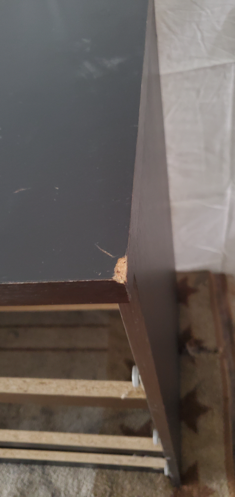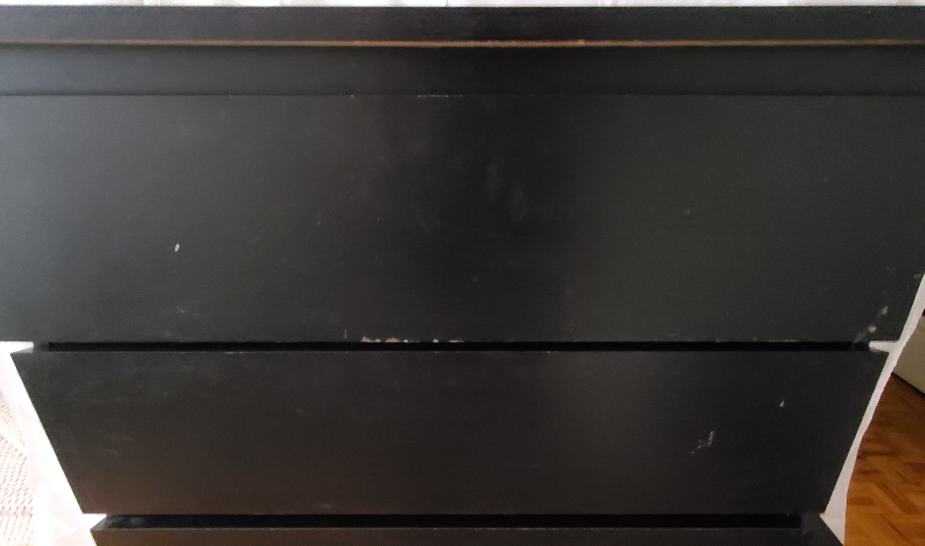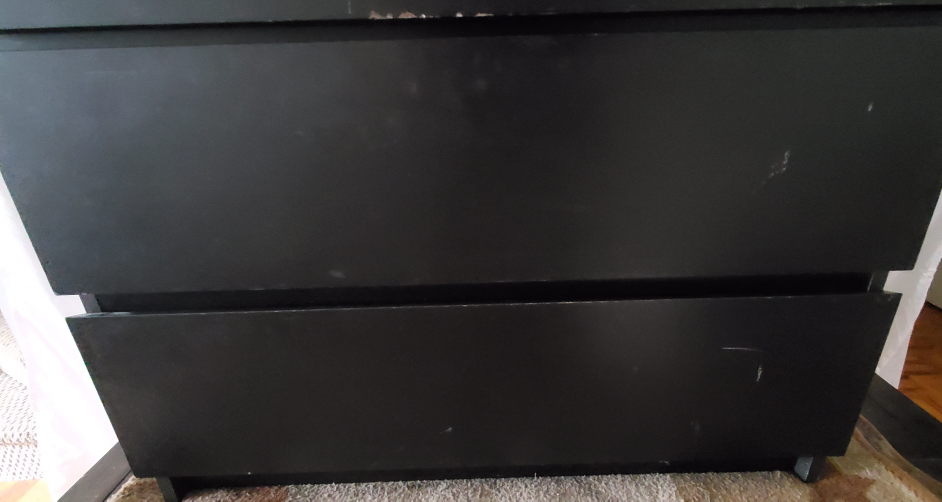 Some number of blemishes, you can see for yourself. Chip off the top corner, drawers pull well.