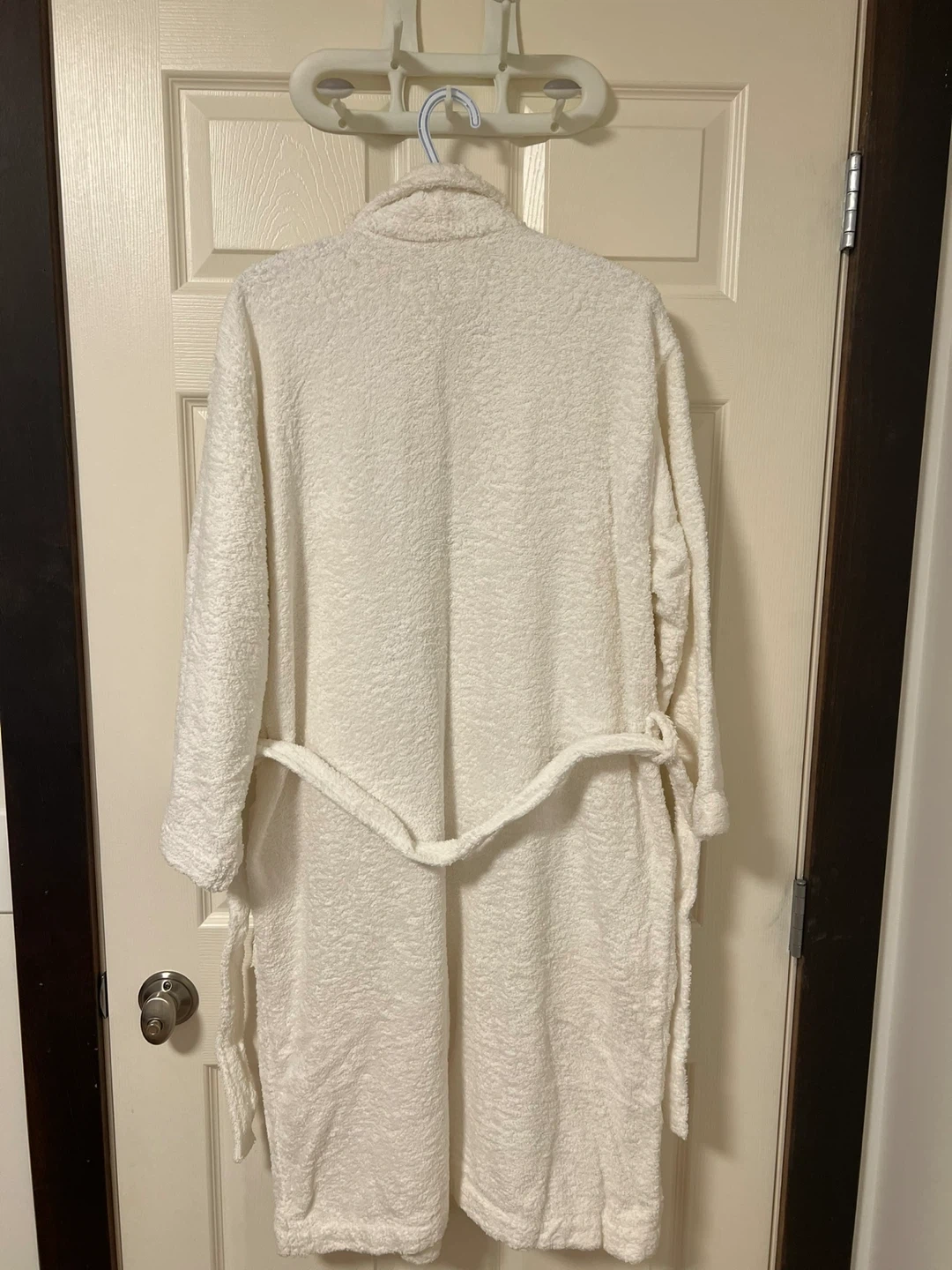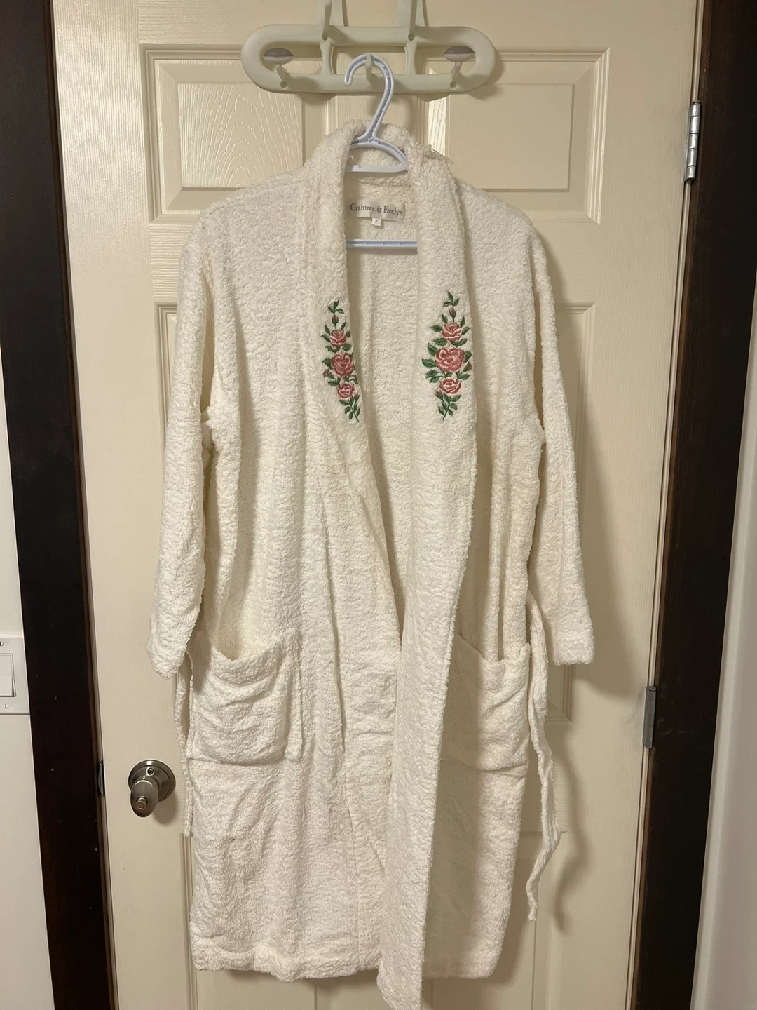 10Cozy up with this Crabtree & Evelyn robe! It's a soft, white robe with a lovely floral design. Perfect for lounging around the house after a shower or just relaxing on a chilly evening