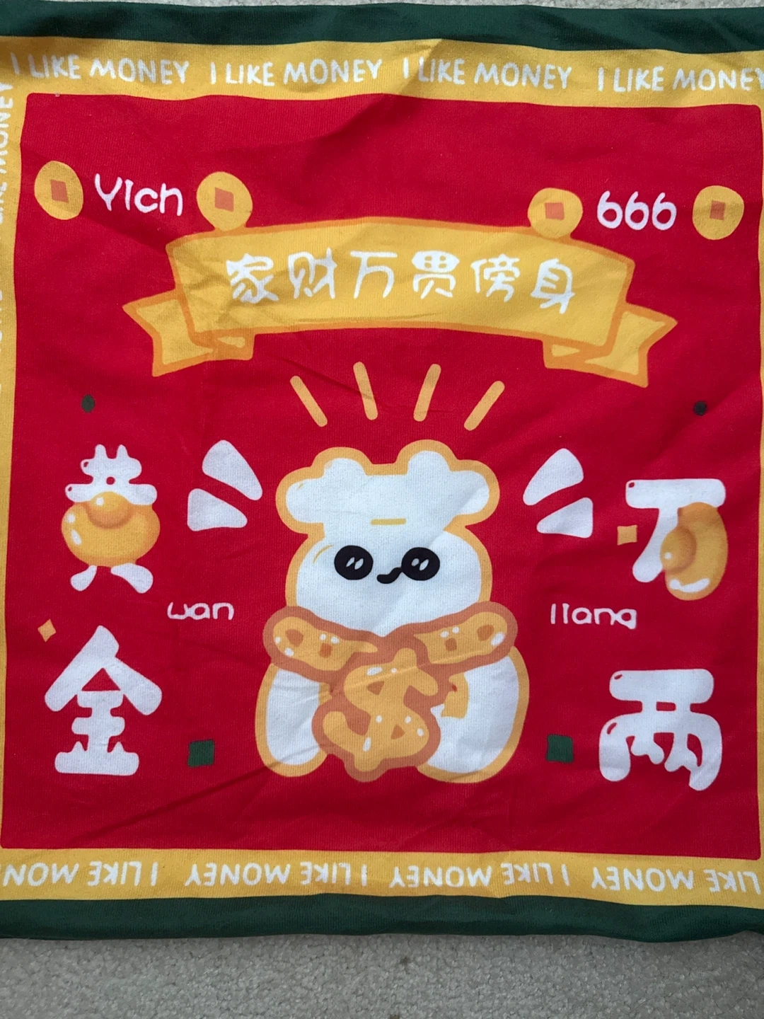 A red pillow cover with lucky money designs. Features text like 'I LIKE MONEY' and symbols for wealth and prosperity. Perfect for adding a festive touch!