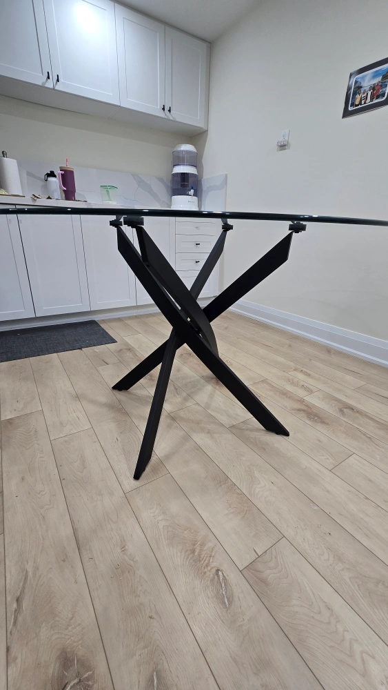 Selling a round glass dining table Only. The table features a modern design with a black, star-shaped base. Great for a small dining area or kitchen! Measure 47"