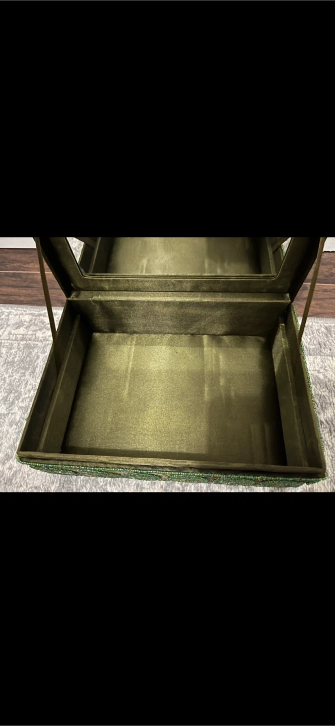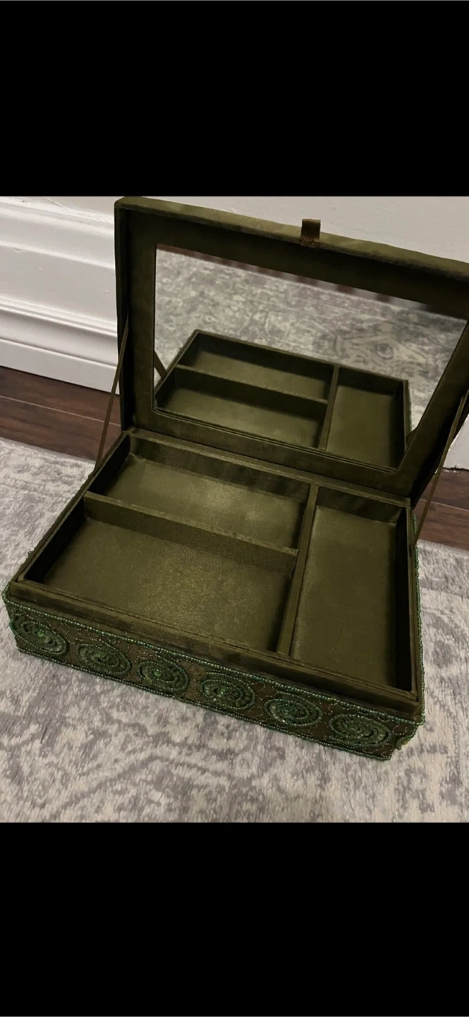 It features a mirror and several compartments inside, perfect for organizing your jewelry. Green beaded jewelry box with a mirror. Kept well taking care of.There is a bit of material probably needs to be glued. A few beads has falling off. Overall it is in good condition. Pick up at 385 Osler street. Cash only. Low ballers will not be answered my price is fixed. No Refunds /Exchange. If you see it posted on here it means it is still available, so please don't ask. ***First come first serve. Just tell me when would you like to pick up. I won't answer to "I'm interested in this or l'm interested in buying" if it's up, it's available. Feel free to also check my other listings! Available Weekdays after 6:30-7:30.