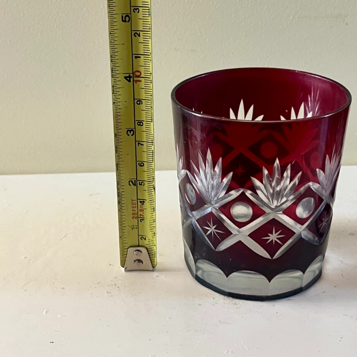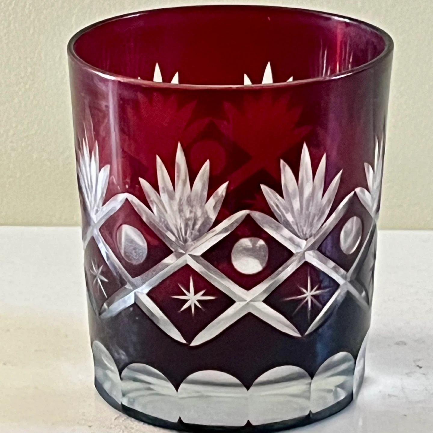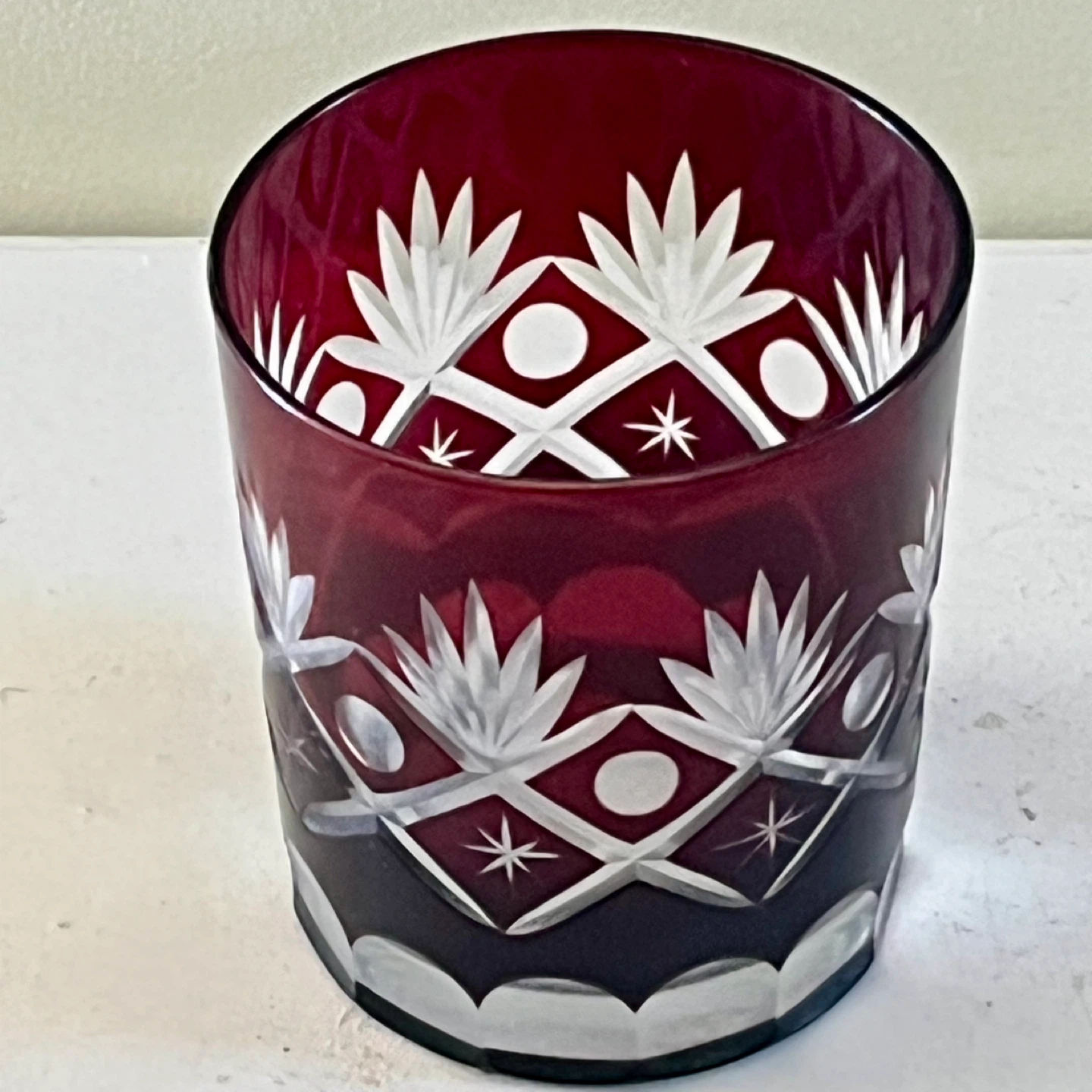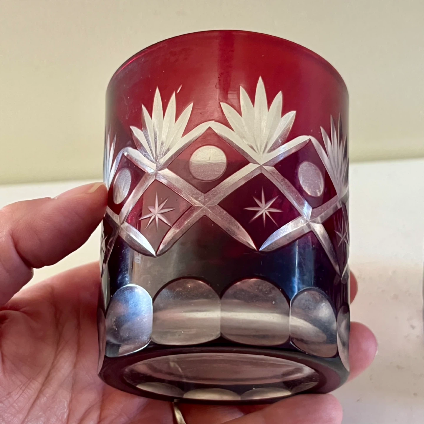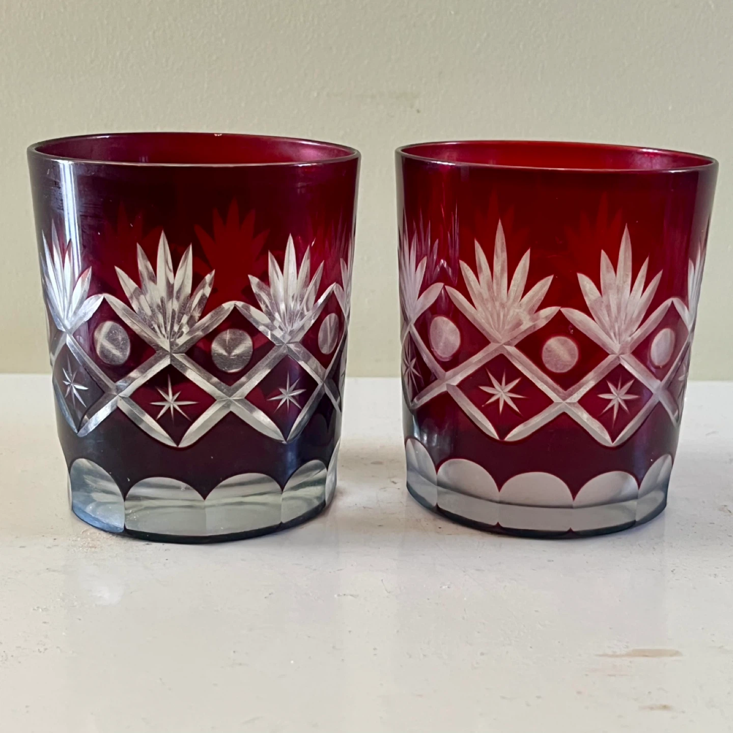 Set of two ruby red Bohemian cut crystal glasses, circa 1960’s. Good vintage condition.