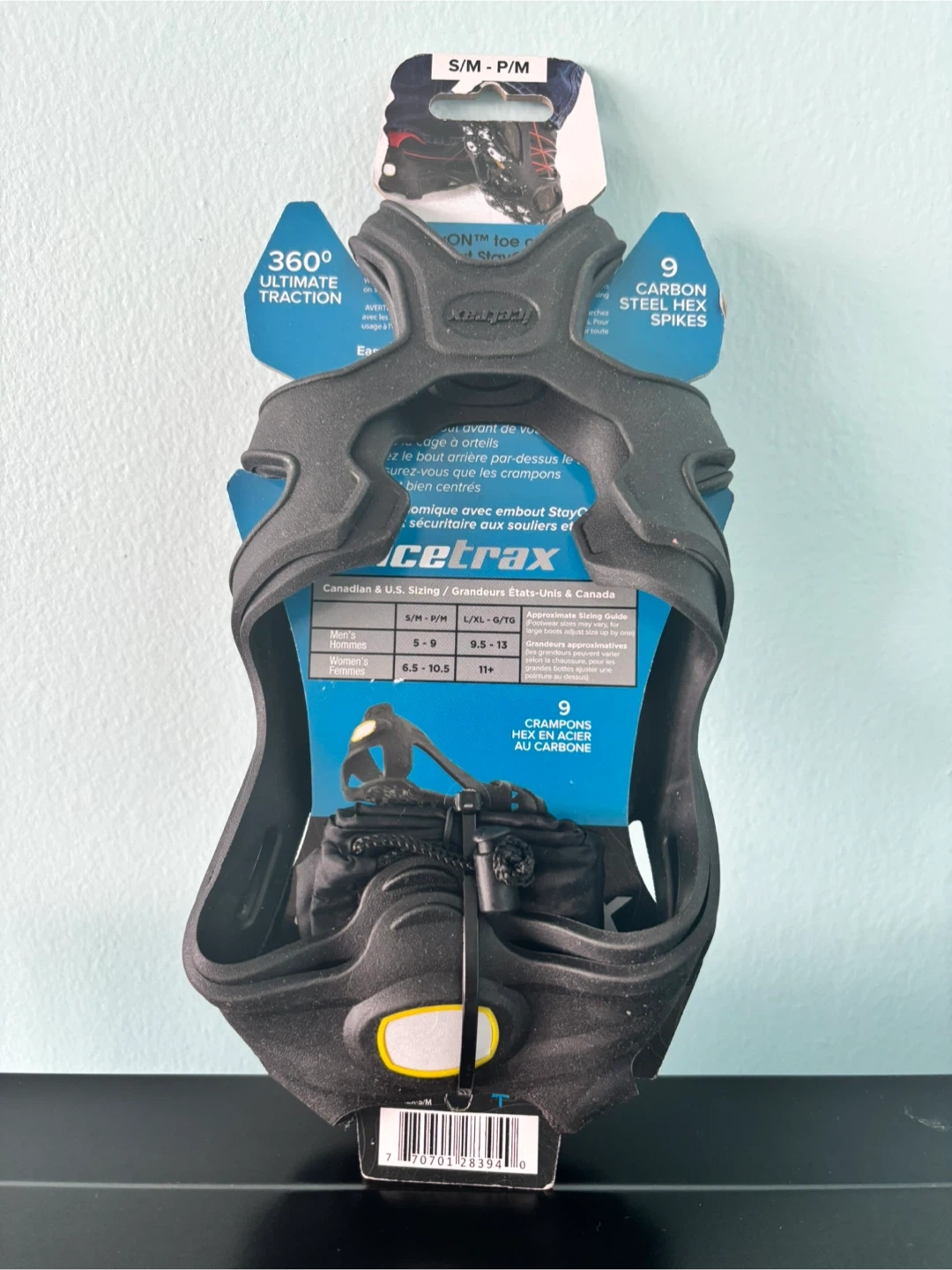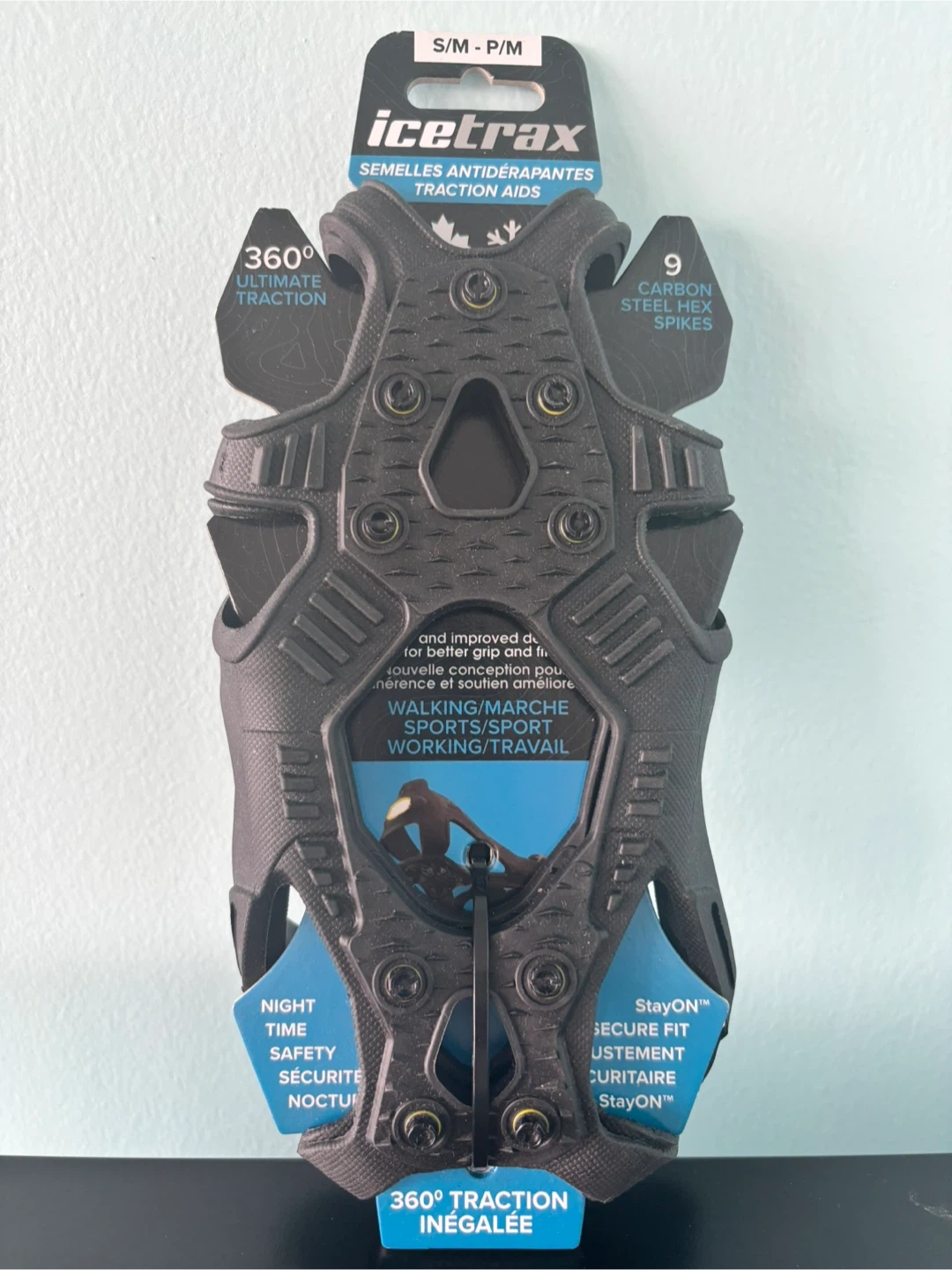 Selling a pair of icetrax traction aids! These are size S/M. They feature 360° ultimate traction and 9 carbon steel hex spikes for better grip. Perfect for walking, sports, or working in icy conditions. StayON secure fit!