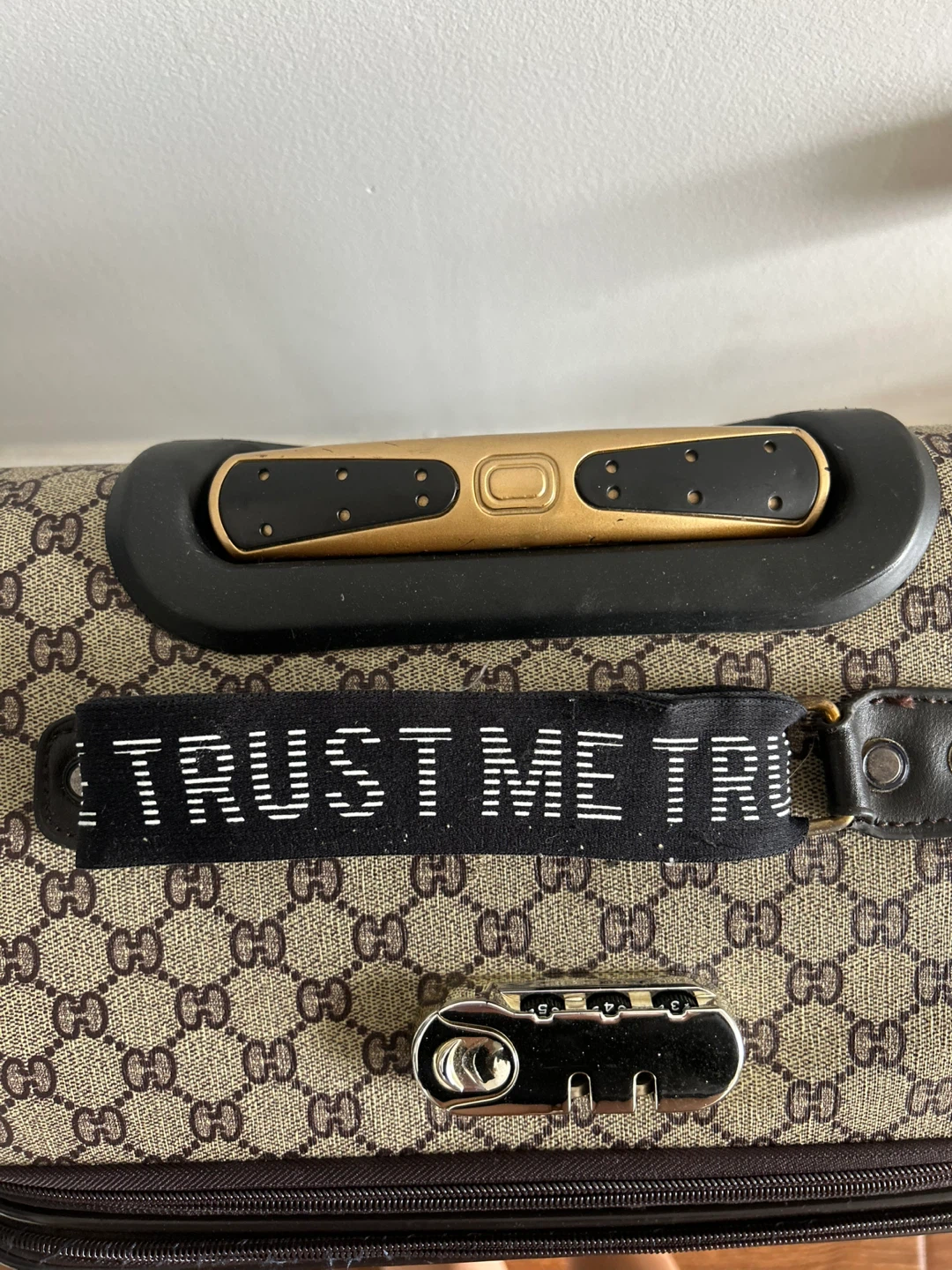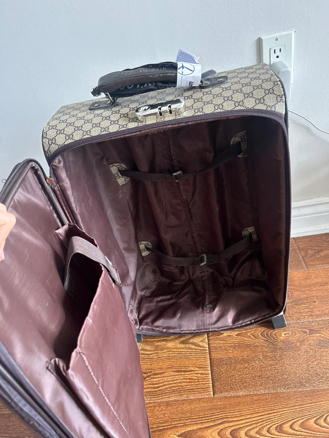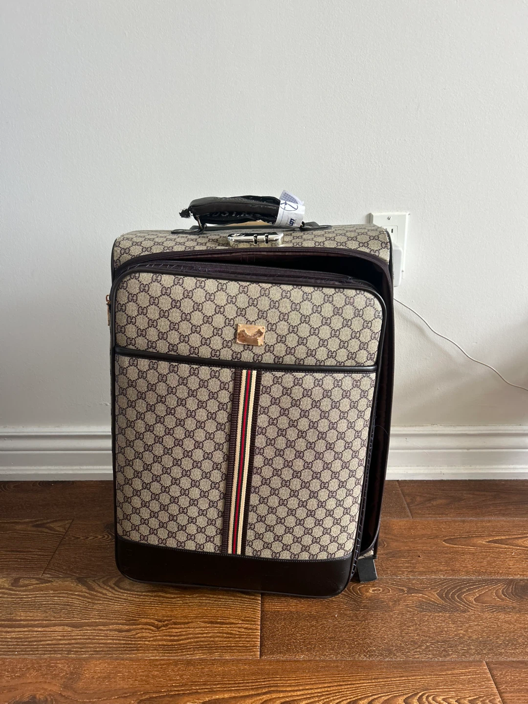 Selling a Gucci suitcase. It features the iconic Gucci pattern and a retractable handle. It has a combination lock for security and interior straps to keep your belongings in place. Perfect for travel!