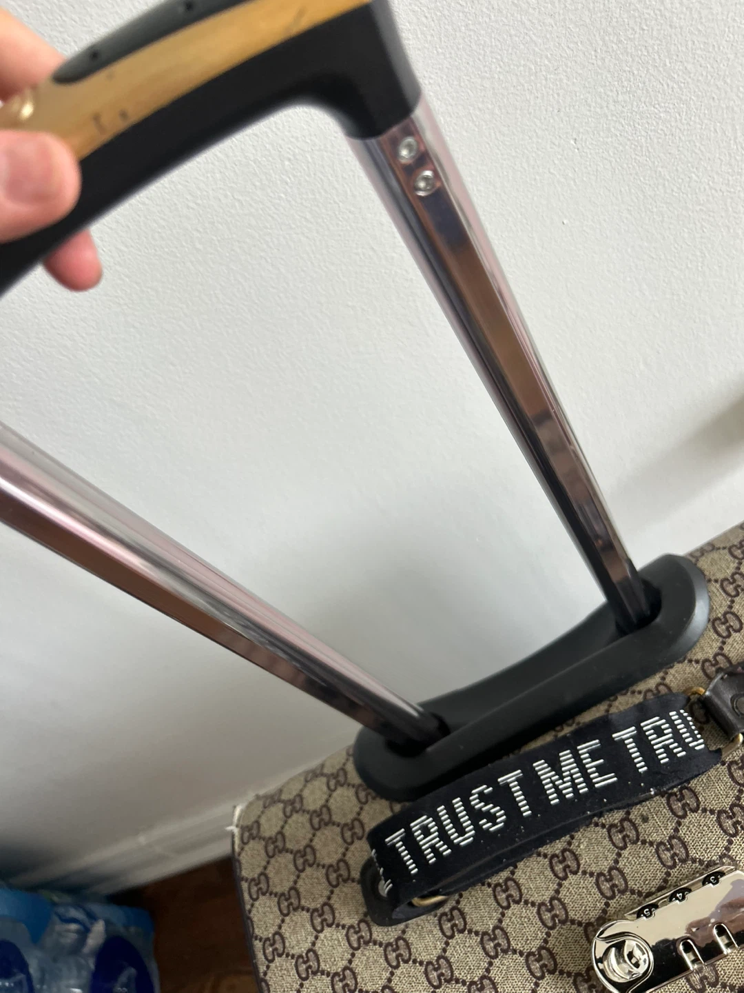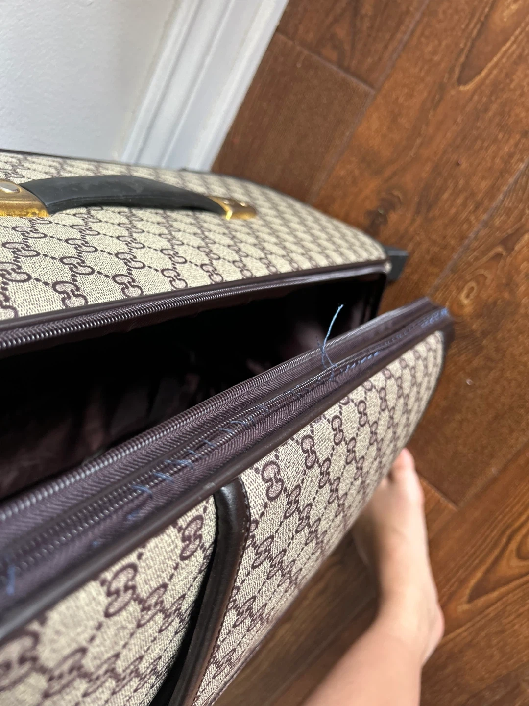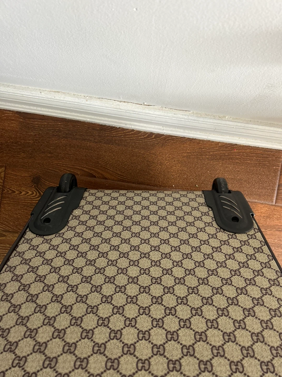 Selling a Gucci suitcase. It features the iconic Gucci pattern and a retractable handle. It has a combination lock for security and interior straps to keep your belongings in place. Perfect for travel!