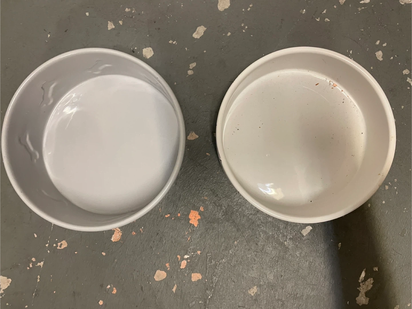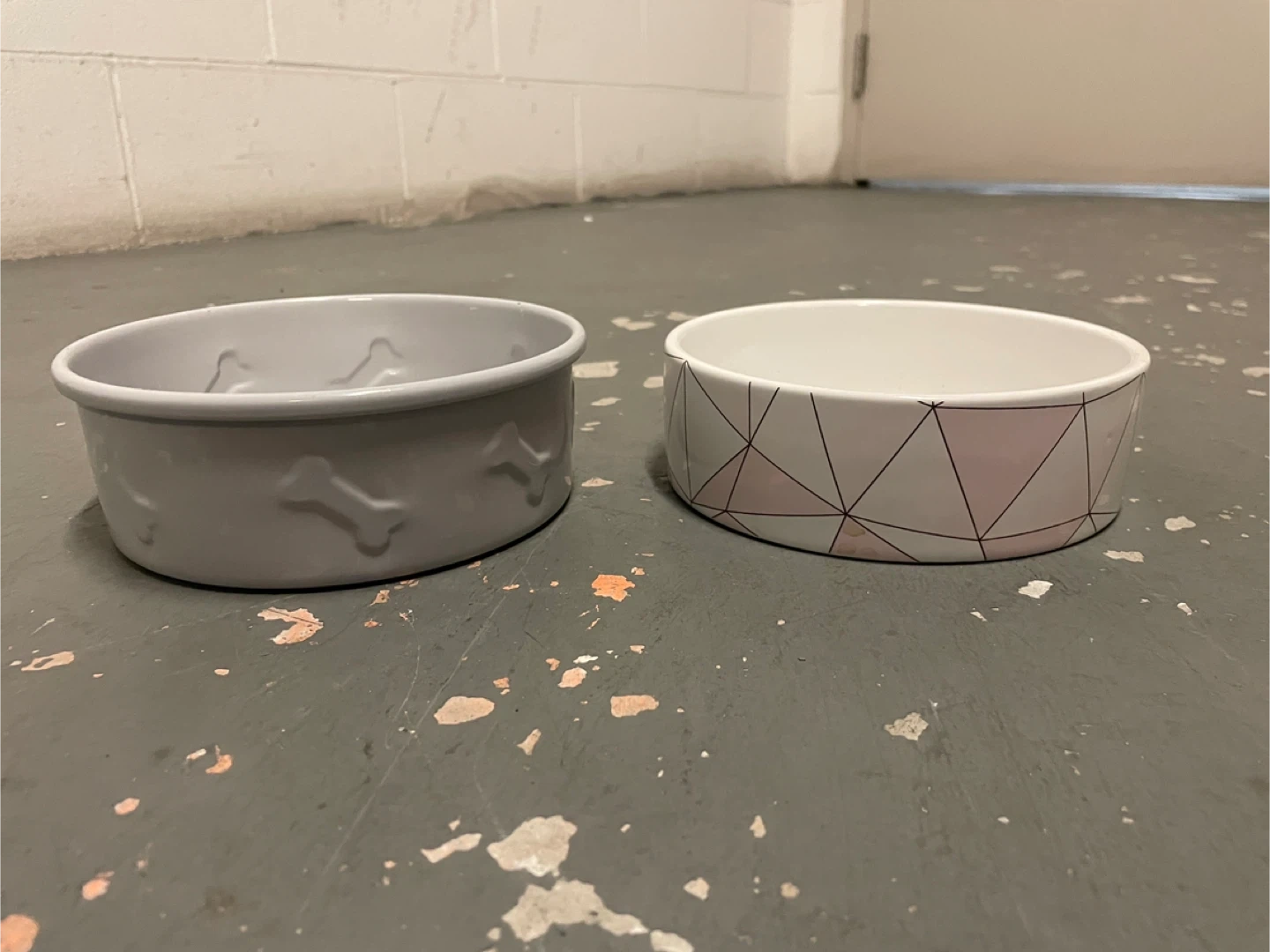 Two pet bowls for sale! One is a solid grey with bone designs around the side. The other is white with a geometric pink and grey design. Perfect for your furry friends.
