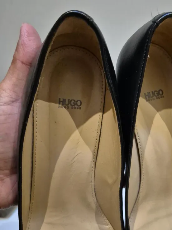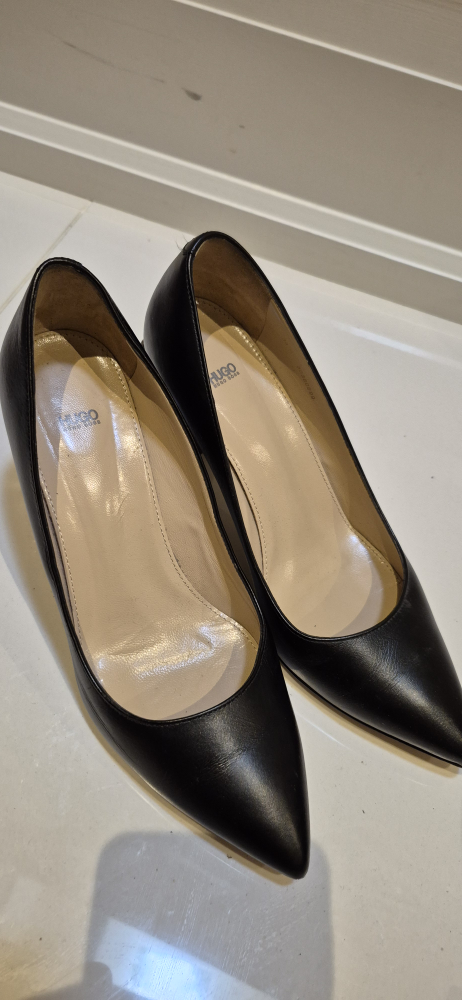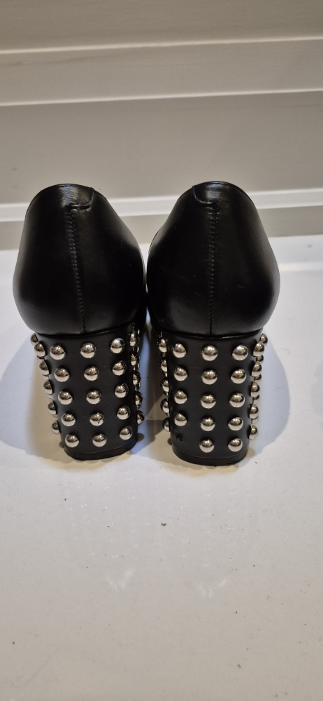 Selling a pair of Hugo Boss black leather heels. Size 8.5. They have a unique studded design on the heel. Perfect for adding a bit of edge to your outfit!