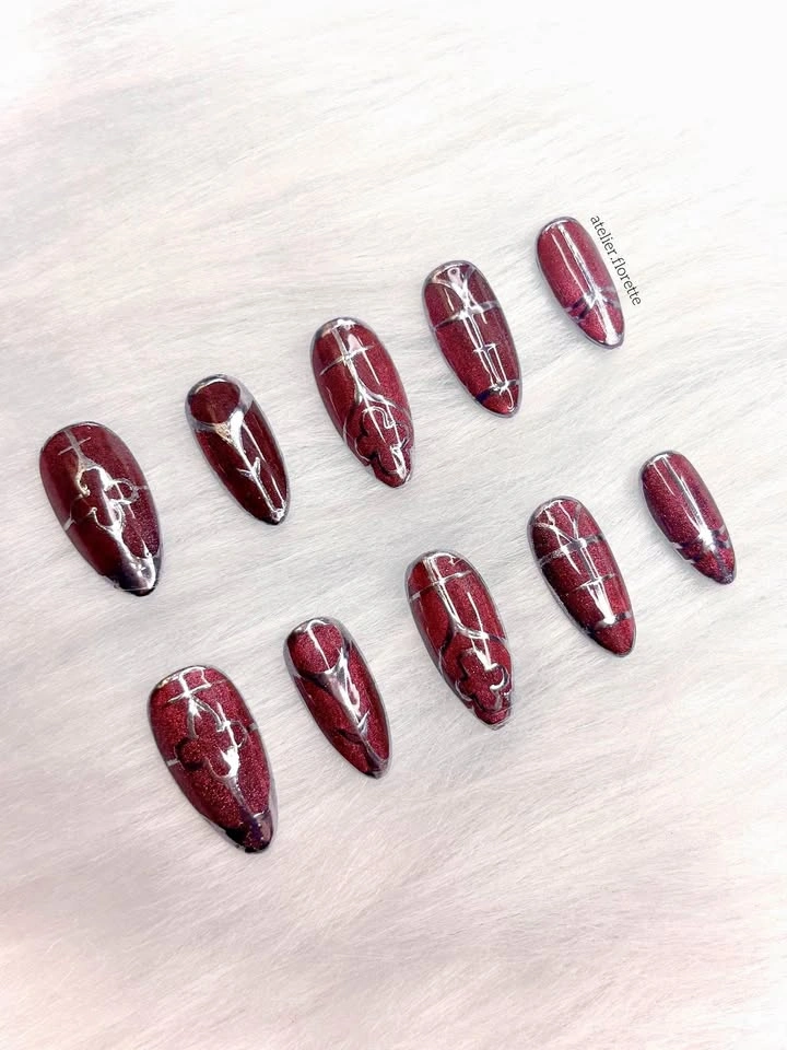 Fresh off the press and ready for purchase! These were made in size small (details in slide 2 and 3). More of a purple/wine shade than what is shown in the photo (see last slide). They will include a prep kit (file, pusher, alcohol pad, sticky tabs and glue). If these sizes don’t fit you, I also do custom sets! Check out @atelier.florette on instagram or my other listings for more designs