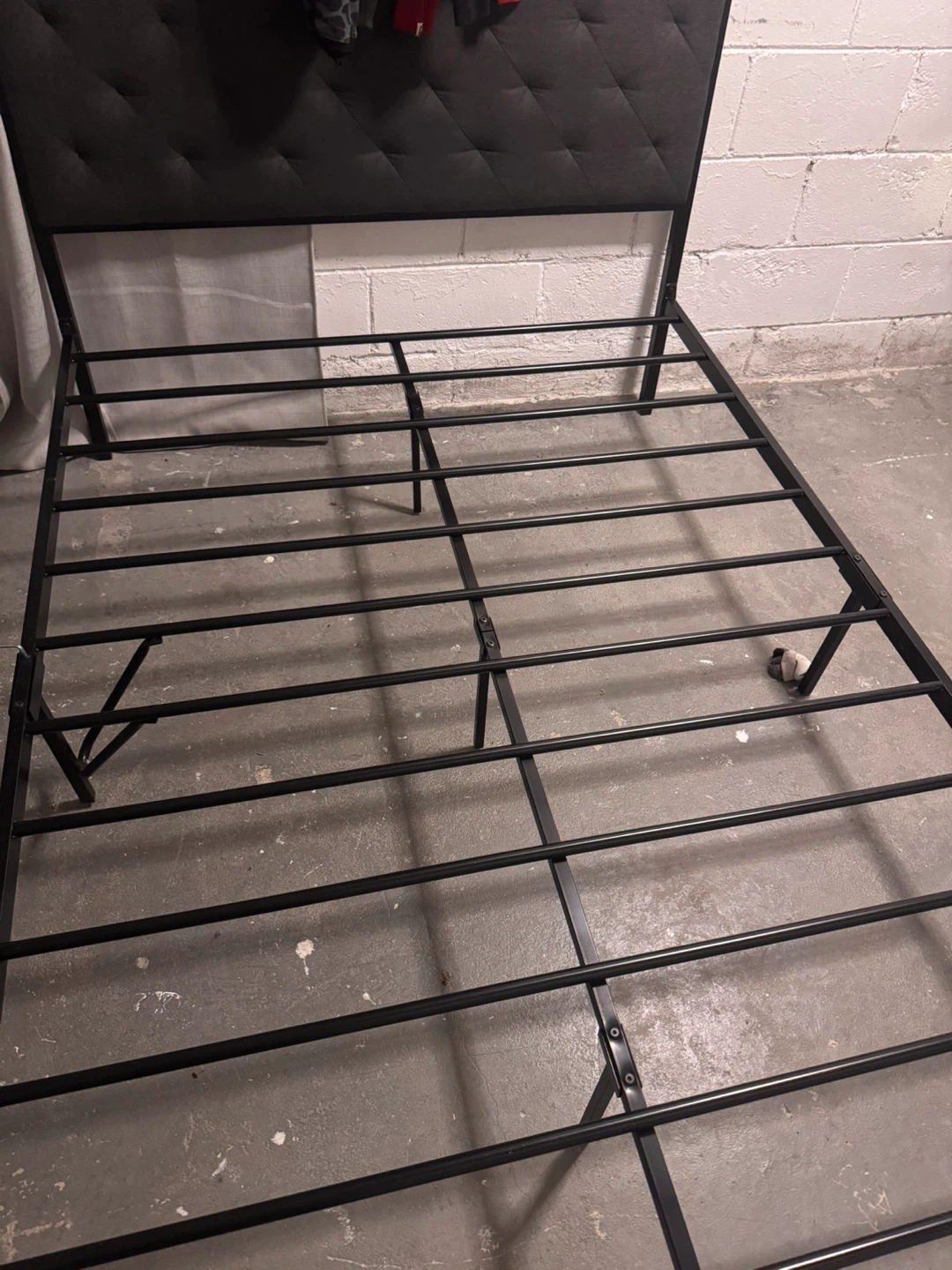 Selling a Twin-size bed frame with a headboard. The frame is black metal and the headboard is a dark grey fabric with a diamond pattern. It's in good condition and ready for a new home!