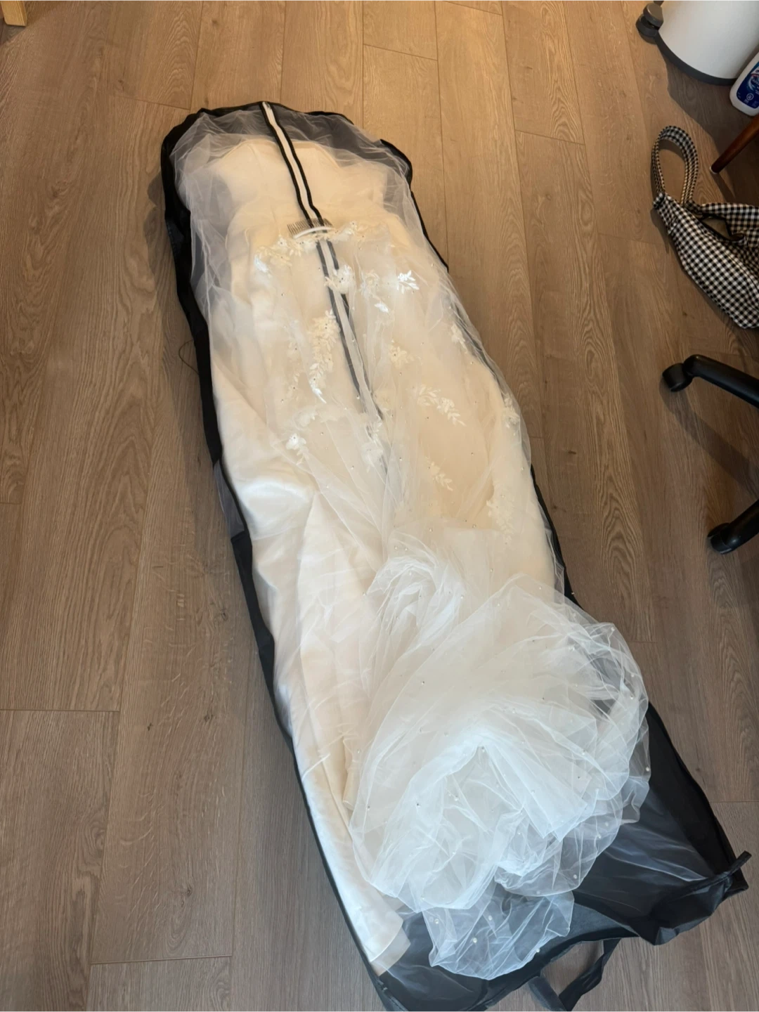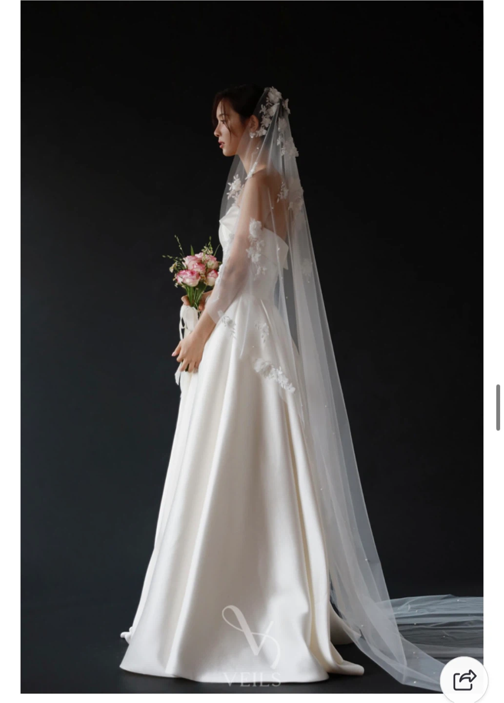 It was tailored to fit my height (156 cm / 5’1” + 9 cm heels) — the front hem just touches the floor, and the back flows longer for a graceful look. Include the veil that same as the pictures.
