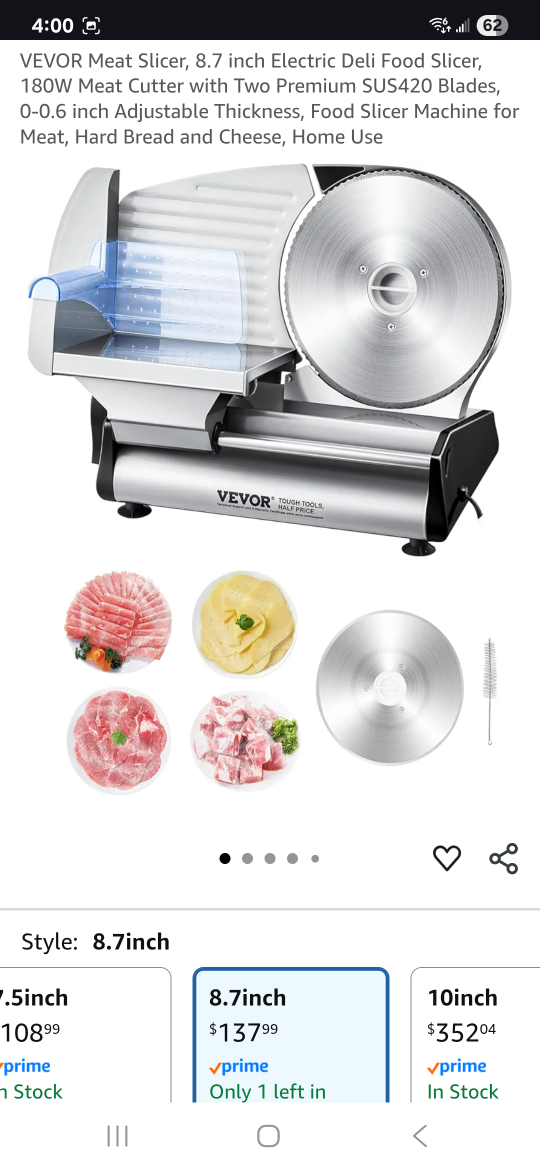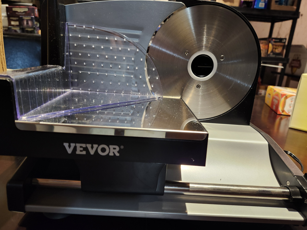 Selling a VEVOR 8.7 inch electric food slicer, very similar to this model but It has a 200 W motor instead of 180W. It comes with two premium SUS420 blades. You can adjust the thickness from 0-0.6 inches. It's great for slicing meat, hard bread, cheese, and more for home use. Includes the box, tray and cleaning cloth
