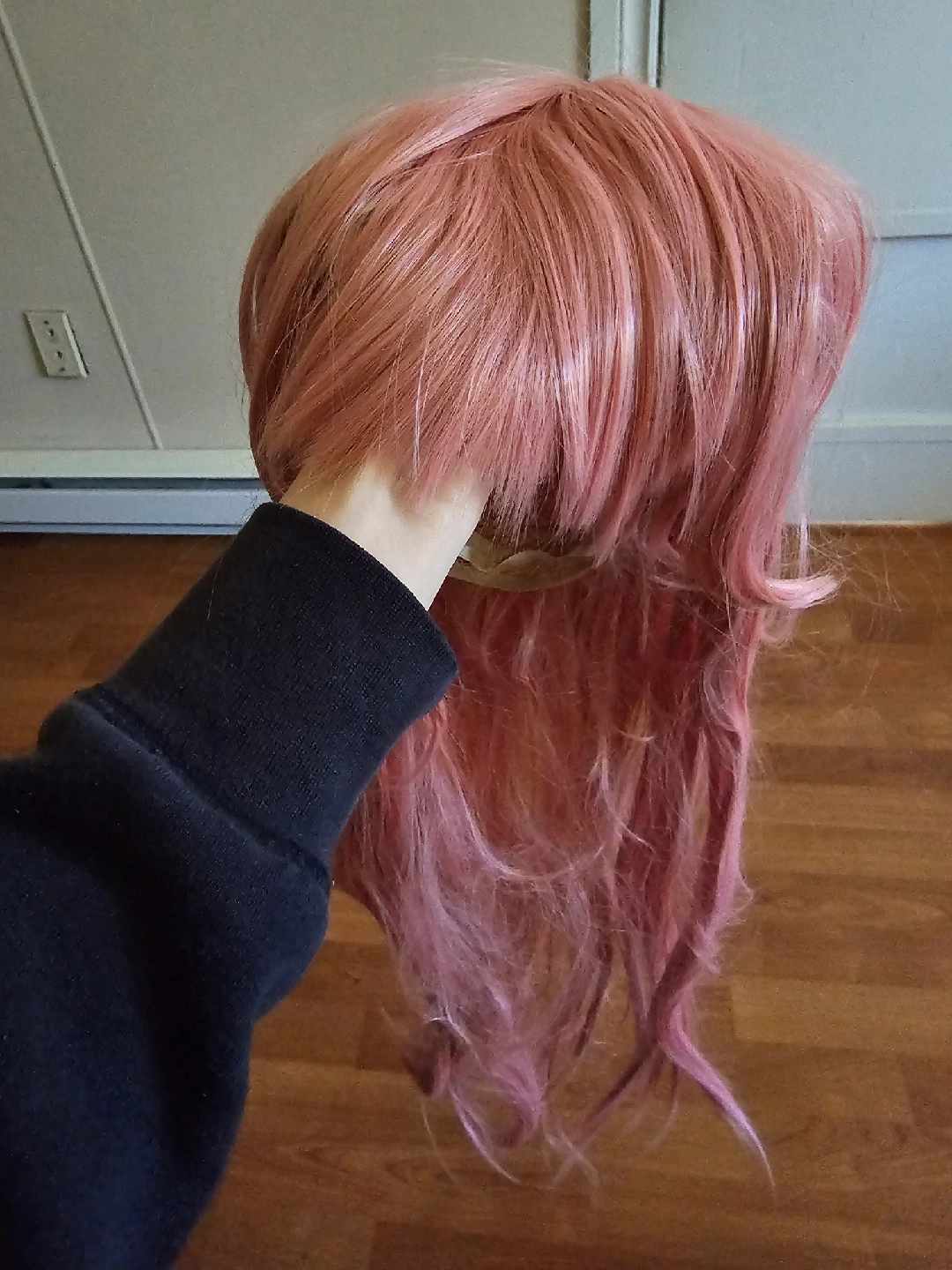 Selling a pink cosplay wig. It's in great condition and perfect for costumes or just for fun. The colour is a lovely light pink, and it's a long style wig. It's been stored carefully in a bag to keep it clean. Worn once only, great for Halloween! Note that I trimmed the bangs a bit