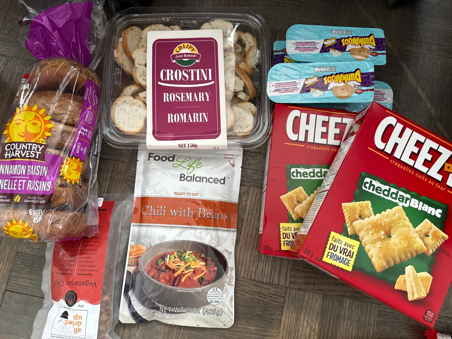 Selling a selection of tasty snacks! Includes Country Harvest Cinnamon Raisin bread, Crispy Crostini Rosemary, Food Life Balanced Chili with Beans, DunkAroos, and Cheez-It craquelins au cheddar blanc. Perfect for stocking up your pantry!