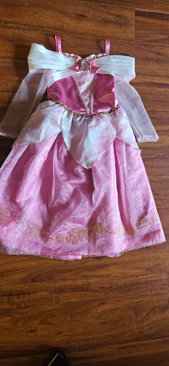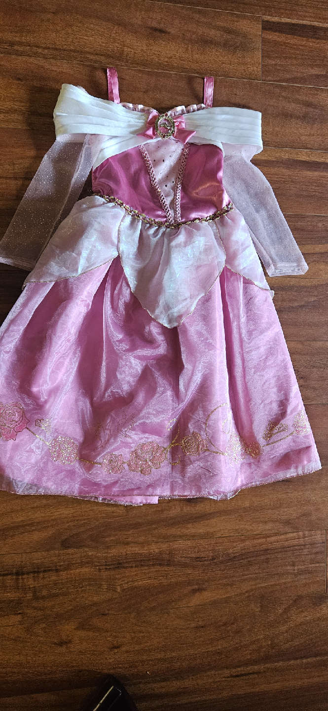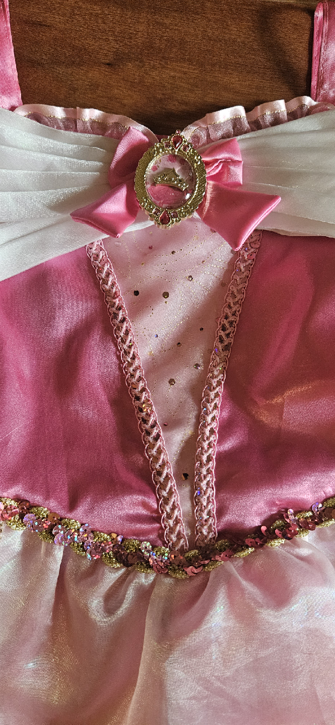 Selling a beautiful Aurora (Sleeping Beauty) dress-up costume! It's in great condition and perfect for any Disney fan or dress-up occasion. The dress is pink and white, with gold detailing.