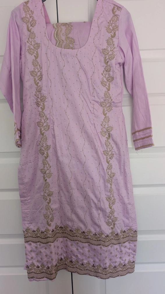 Beautiful lilac salwar kameez suit with intricate gold embroidery! The fabric feels soft and comfortable, perfect for special occasions or everyday wear. The set includes the kameez (top), salwar (pants), and dupatta (scarf).