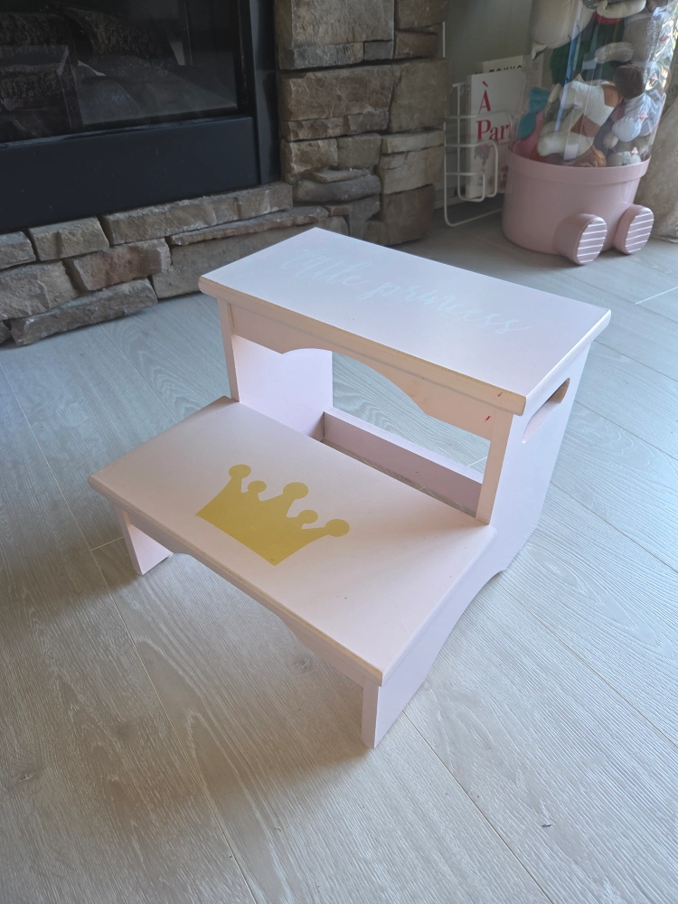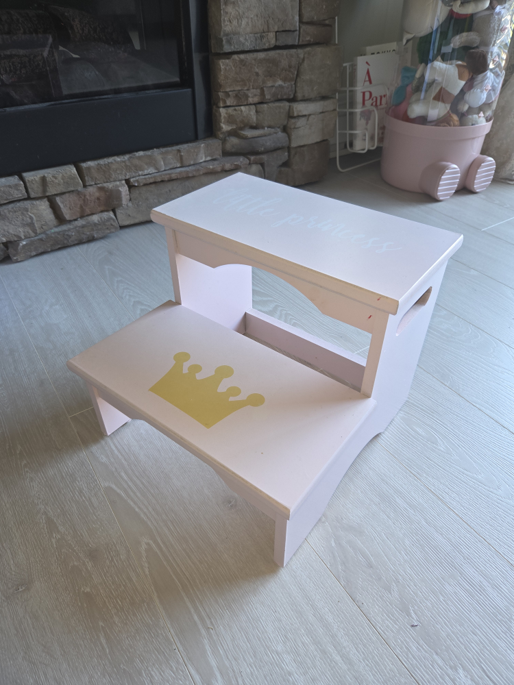 A cute little pink step stool, perfect for a child's room! It has a gold crown design on the lower step and "Little Princess" written on the top step. It's in great condition and ready for a new home.