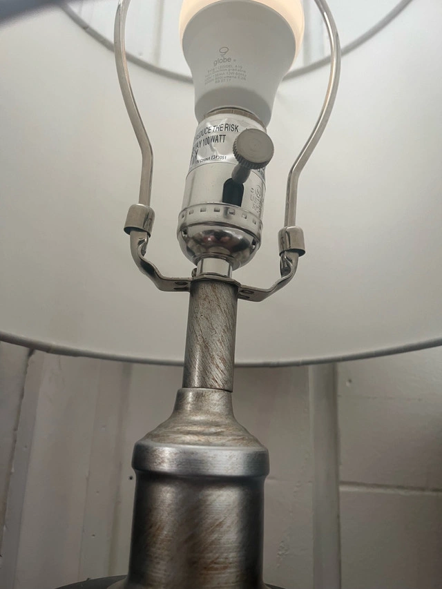 88Stylish table lamp. Features a cylindrical black base and a white fabric shade. Silver toned accents. In good used condition.