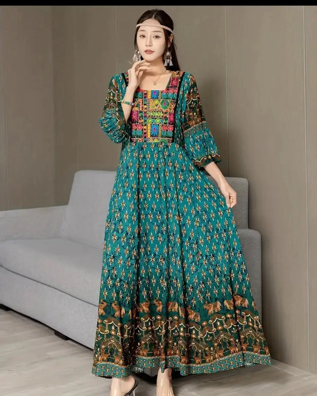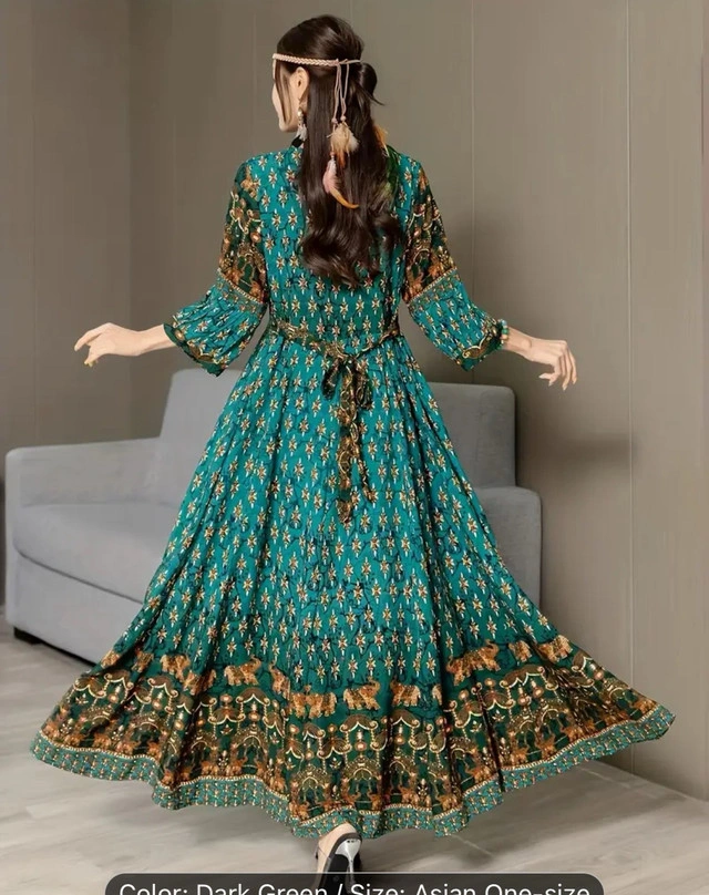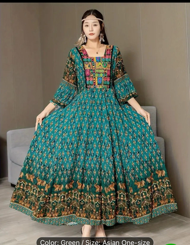 88Beautiful green maxi dress. Features bell sleeves, embroidered details, and a flowing silhouette. Asian one-size. Ethnic Floral Pattern Maxi Dress, Boho Square Neck 3/4 Sleeve Dress, Women's Clothing